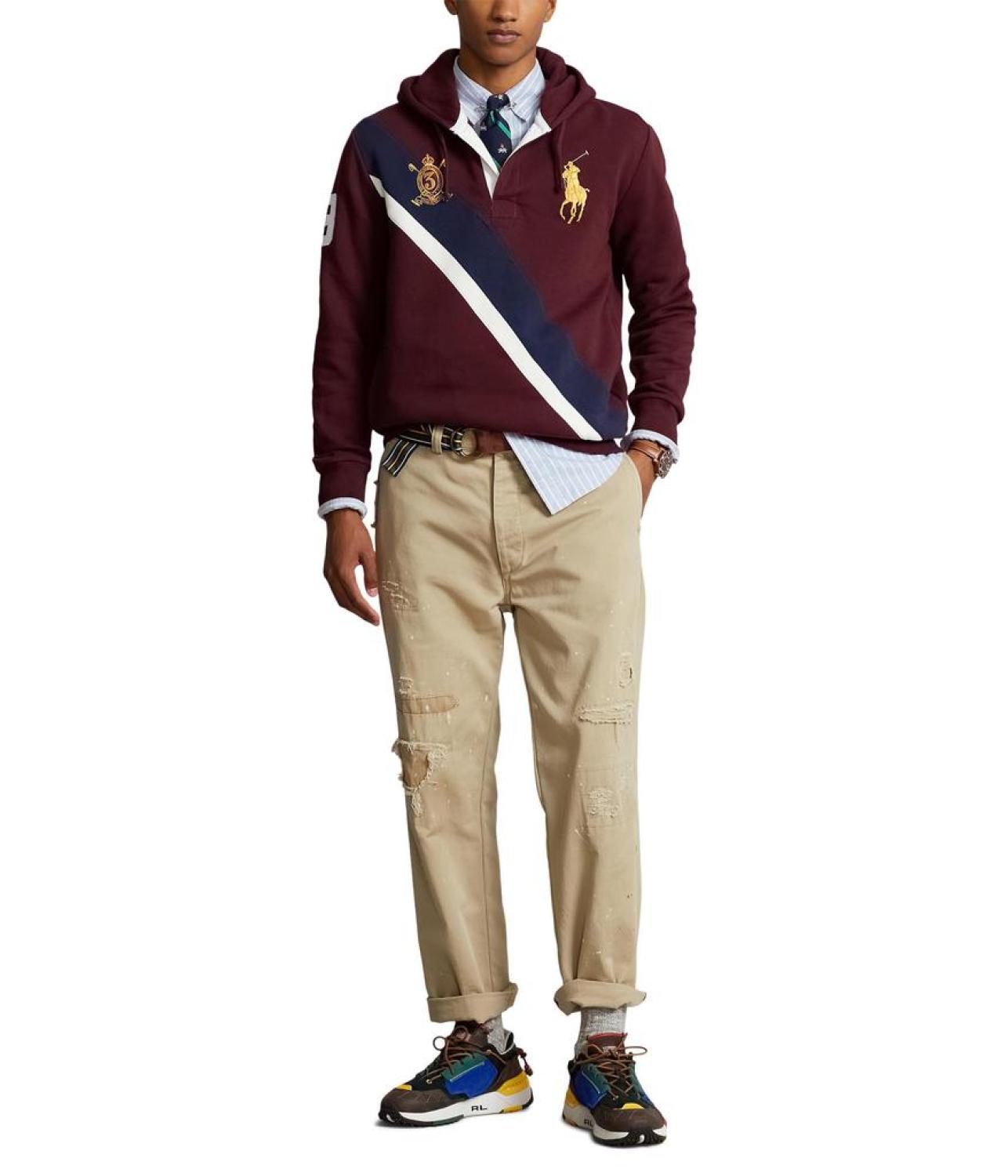 • Look your best while staying in full comfort in the Polo Ralph Lauren® Big Pony Fleece Rugby Hoodie.  The pullover style features a v-neckline in the front with a hood attached.  Branded logo and designs are featured on the front.