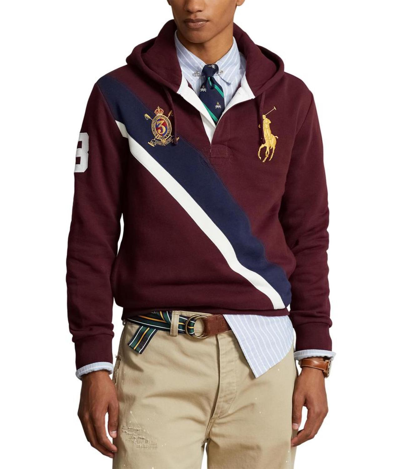 Look your best while staying in full comfort in the Polo Ralph Lauren® Big Pony Fleece Rugby Hoodie.  The pullover style features a v-neckline in the front with a hood attached.  Branded logo and designs are featured on the front.