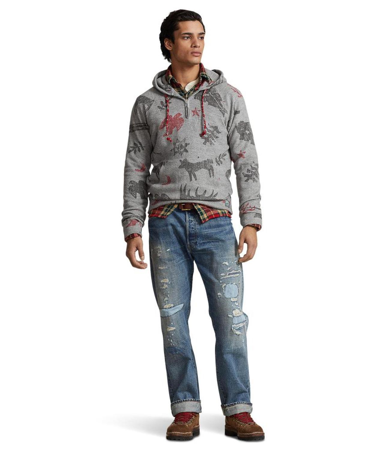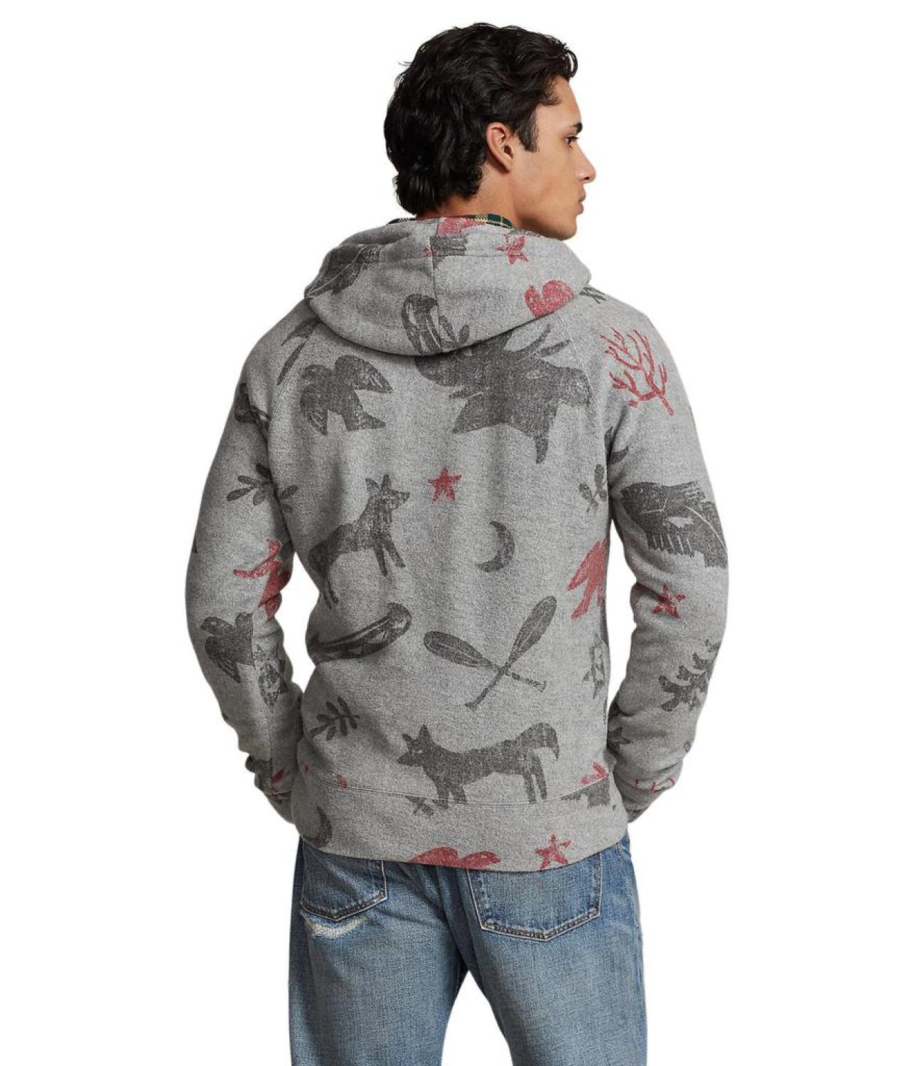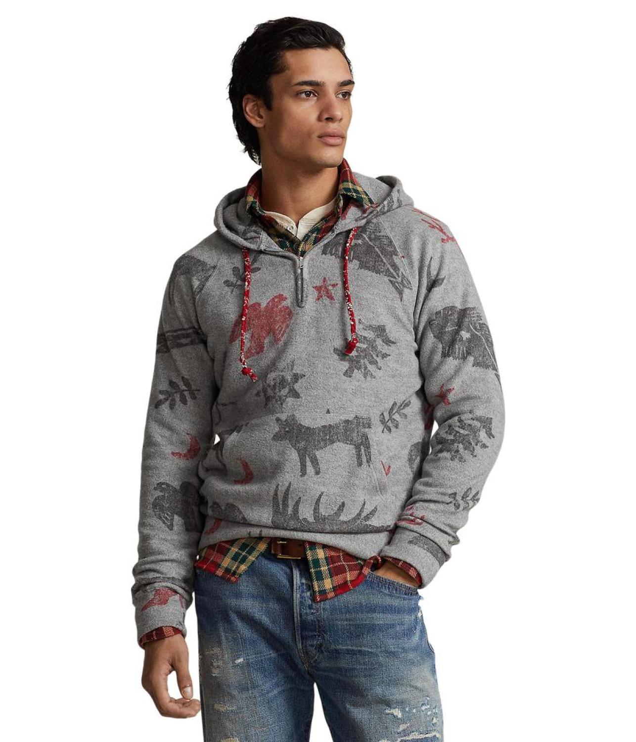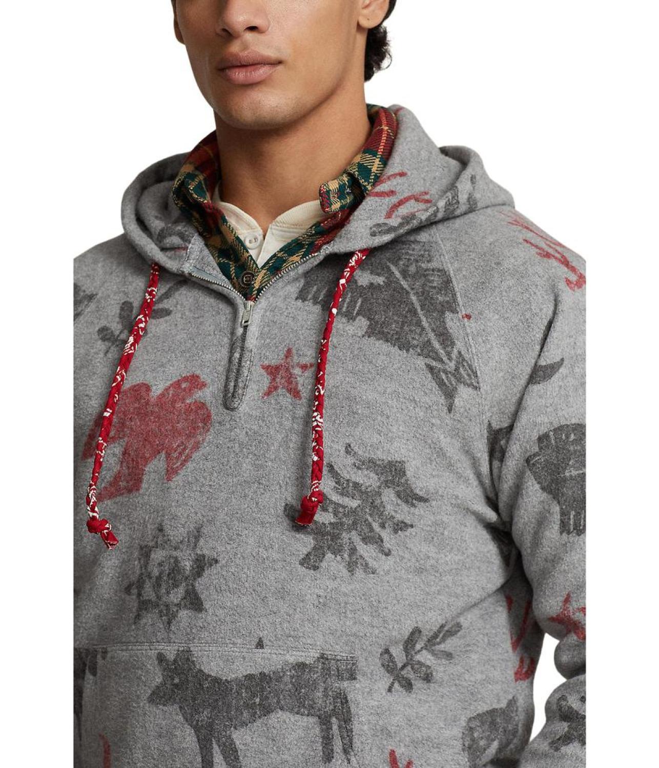 • Embrace a cool and comfy style during those chilly day outings wearing the Polo Ralph Lauren® Brushed Fleece Graphic Hoodie. It is crafted in a soft cotton-blend fabric for all-day comfort and adorned with eye-catching graphics all over. It features an attached hood with adjustable drawcord, quarter zippered front placket, long sleeves, kangaroo front pocket, and ribbed cuffs and hem.