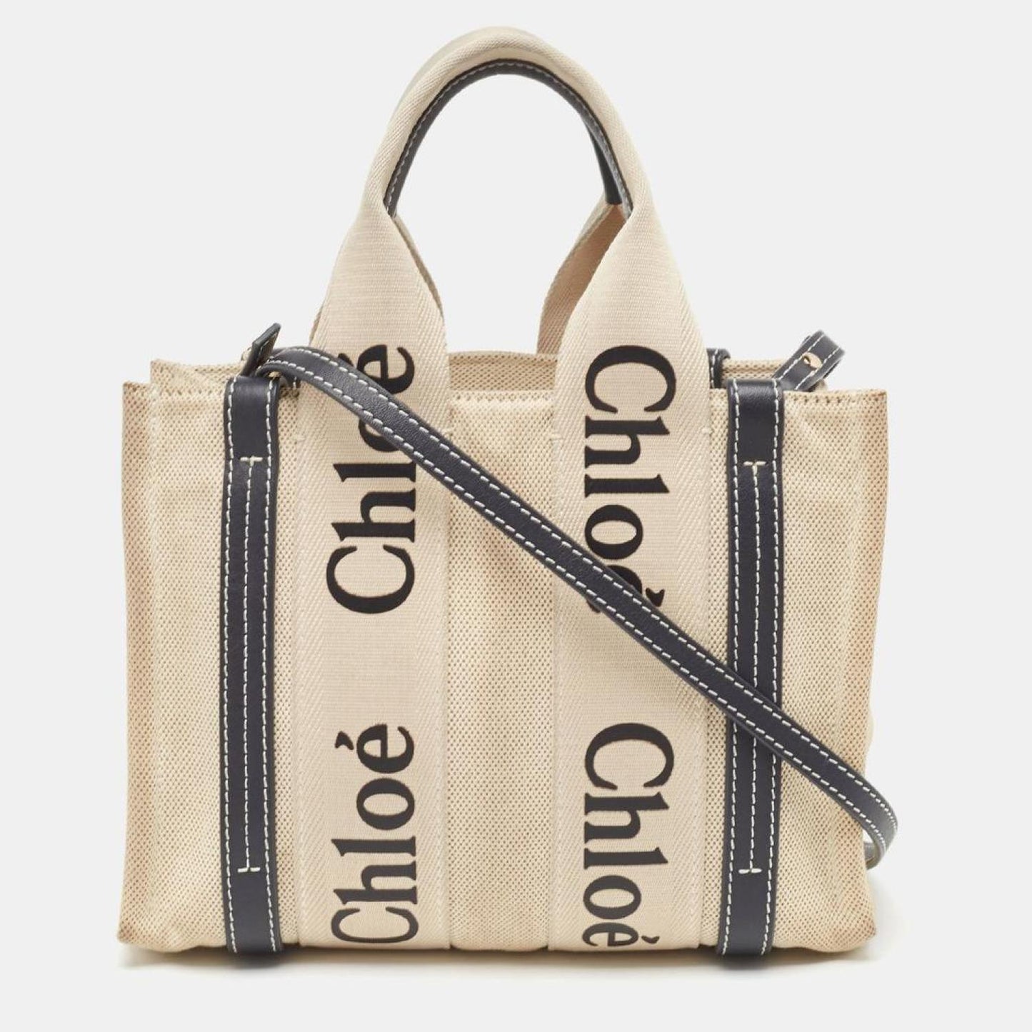 • If you like traveling light then this Chloe Woody tote is an ideal option for you. It is the ultimate favorite of the fashion elite because of its versatility and classy appeal. Created from canvas and leather it exhibits brand detailed stripes on both sides and dual handles at the top. The fabric lined interior of the bag is spacious enough to make it an ideal carry all.