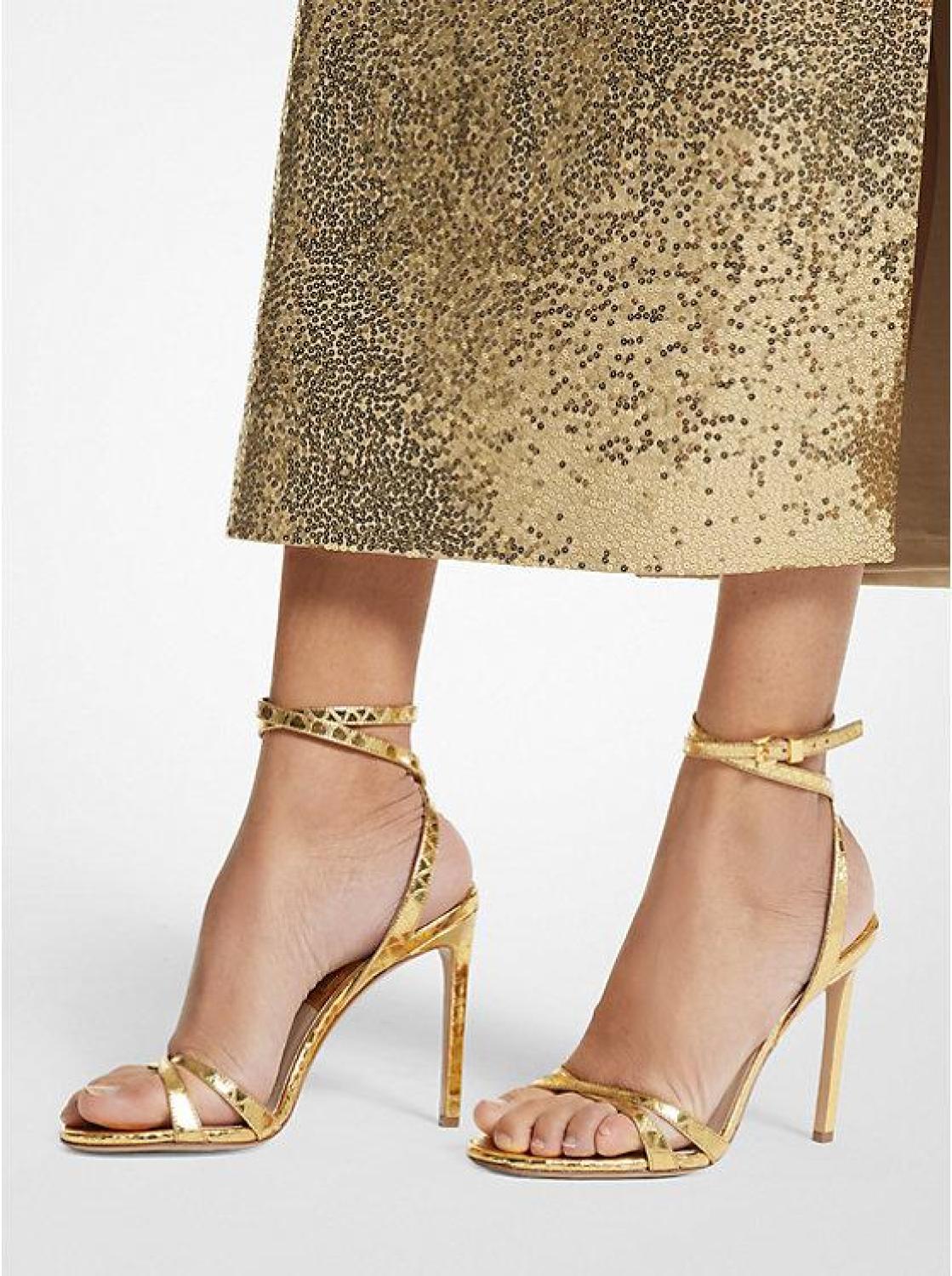 • Styled with sarong skirts on the Spring/Summer 2023 runway, the Chrissy sandals are crafted in Italy from metallic, python-embossed leather. They feature slim crossover straps at the toes and ankle, and rest on a leg-lengthening stiletto heel. With a sophisticated yet alluring silhouette, they’ll fast become your go-to evening shoes.