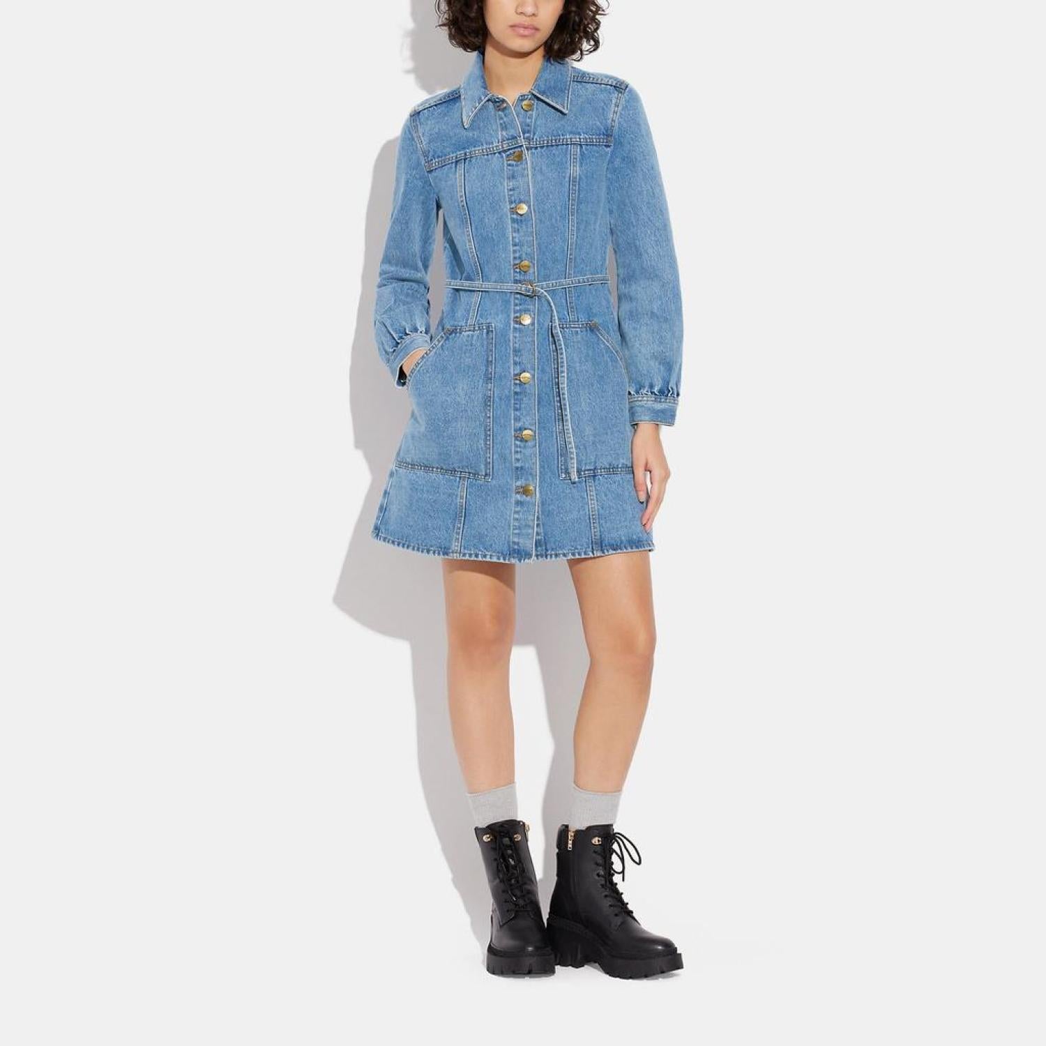 100% cotton Button closure Slip pockets Self-tie belt at waist Length - 34 Machine wash Model is 5'10 (178cm) chest 31 (79cm) waist 24 (61cm) hips 35 (89cm) and wears a size 2 Style No. CG801 | Coach Outlet Denim Dress - Blue, Size - 00