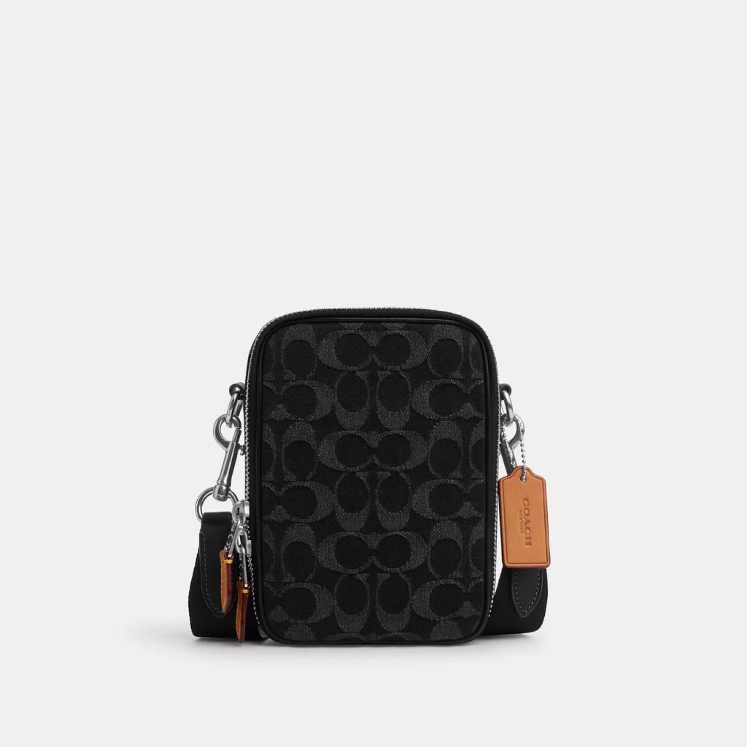 • Signature denim and smooth calf leather Three credit card slots Zip closure fabric lining Detachable strap with 21 drop for shoulder or crossbody wear 5 (L) x 7 (H) x 2 (W) Style No. CO946 | Coach Outlet Stanton Crossbody In Signature Denim - Black