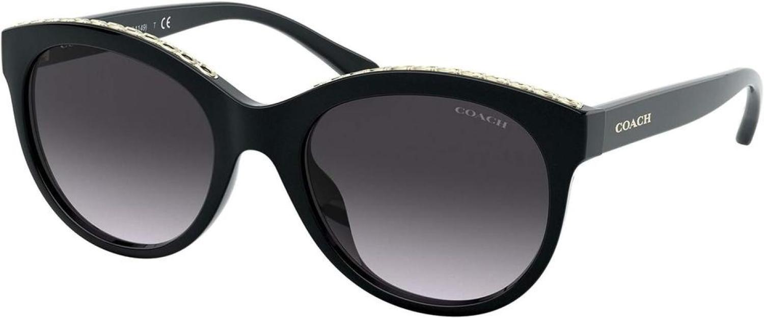 • The Coach women's Sunglasses measure at a 52 mm lens width, 19 mm bridge width, and 140 mm arem length. The frame is round-shaped black black. The lens is 100% UV protection non-polarized grey gradient. (HC8297U-50028G-52)