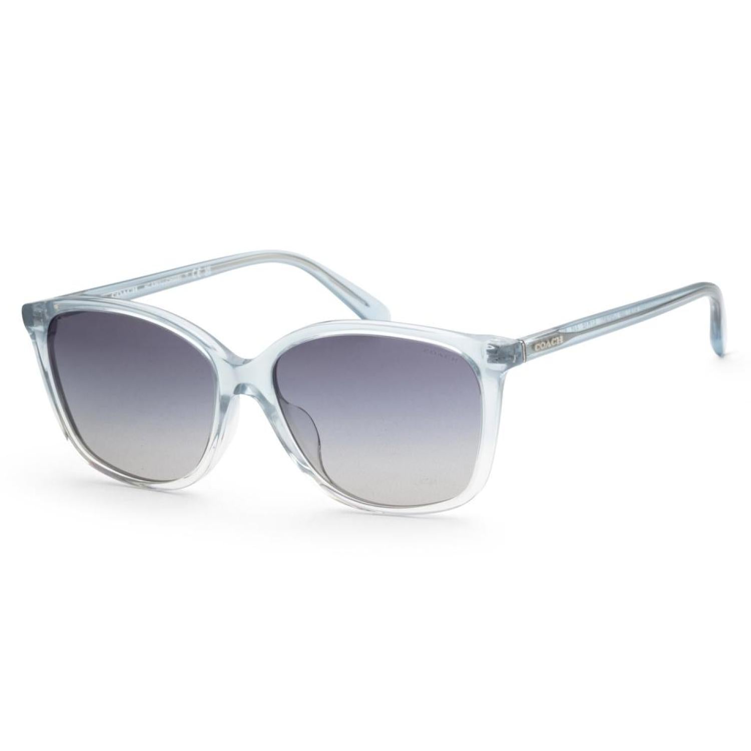 • The Coach women's sunglasses measure at a 57 mm lens width, 16 mm bridge width, and 140 mm arm length. The frame is square-shaped transparent blue gradient acetate. The lenses are blue yellow gradient. Made in China. (HC8361U-573735-57)