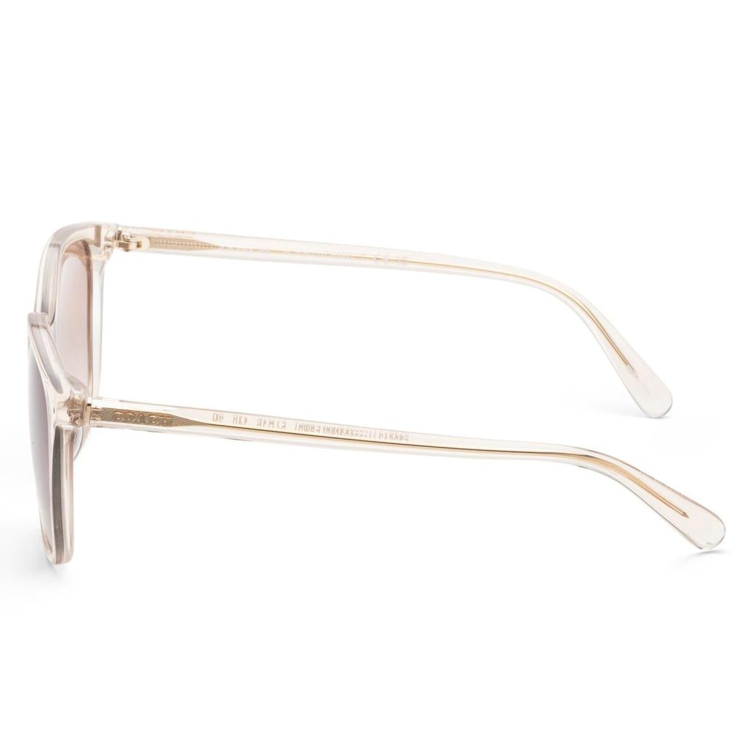 The Coach women's Sunglasses measure at 57 mm lens width, 16 mm bridge width, and 140 mm arm length. The frame is square-shaped transparent fawn acetate. The lenses are non-polarized brown gradient. Made in China (HC8361U-573613-57)