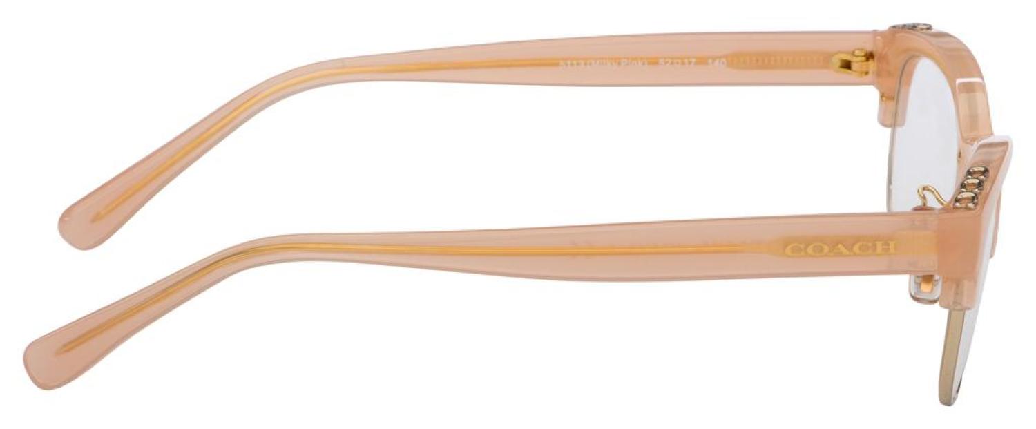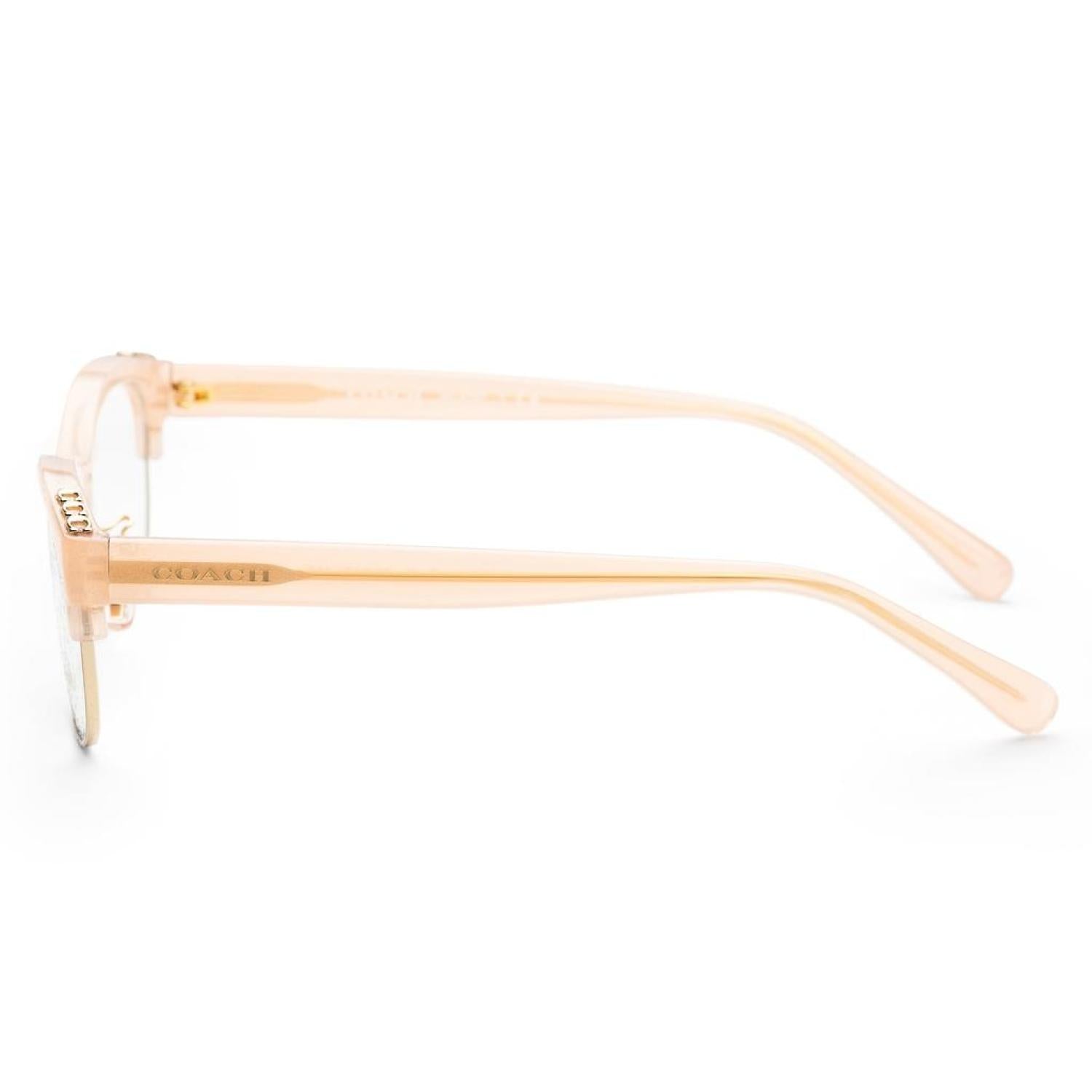 The Coach women's Opticals measure at 52 mm lens width, 17 mm bridge width, and 140 mm arm length. The frame is browline-shaped milky pink metal and plastic. Made in China (HC6157-5113-52)