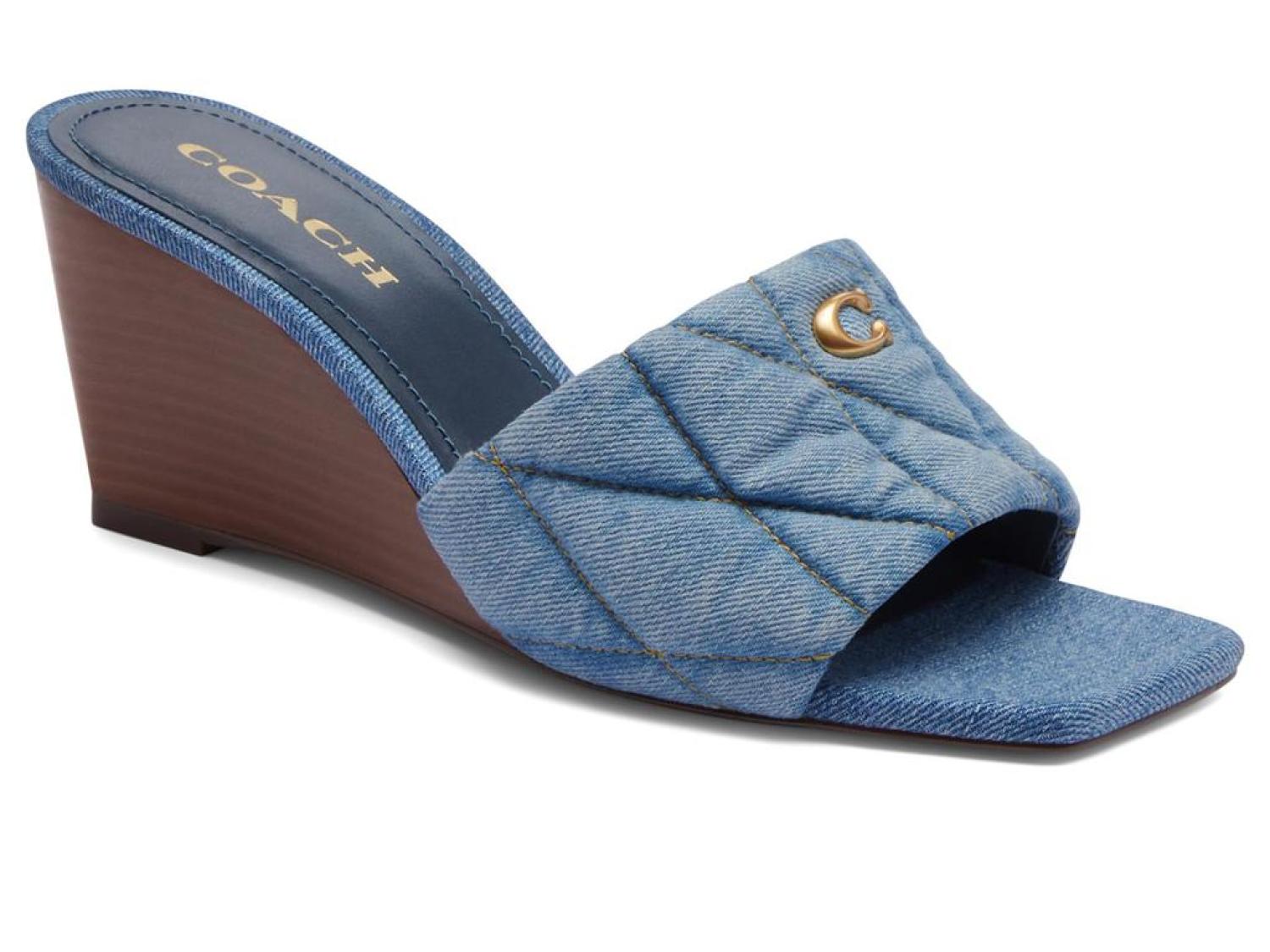 Keep your style as well as comfort game on point from work to weekends donning the COACH® Emma Quilted Denim Wedge Heels. Lightweight and versatile, these easy slip-on shoes are designed with a quilted denim upper with a metallic 'C' logo accent, a faux leather lining, and a padded faux leather insole. Shaped with an open square toe and lifted by the lofty wedge heel, the shoes exude a modern vibe.
