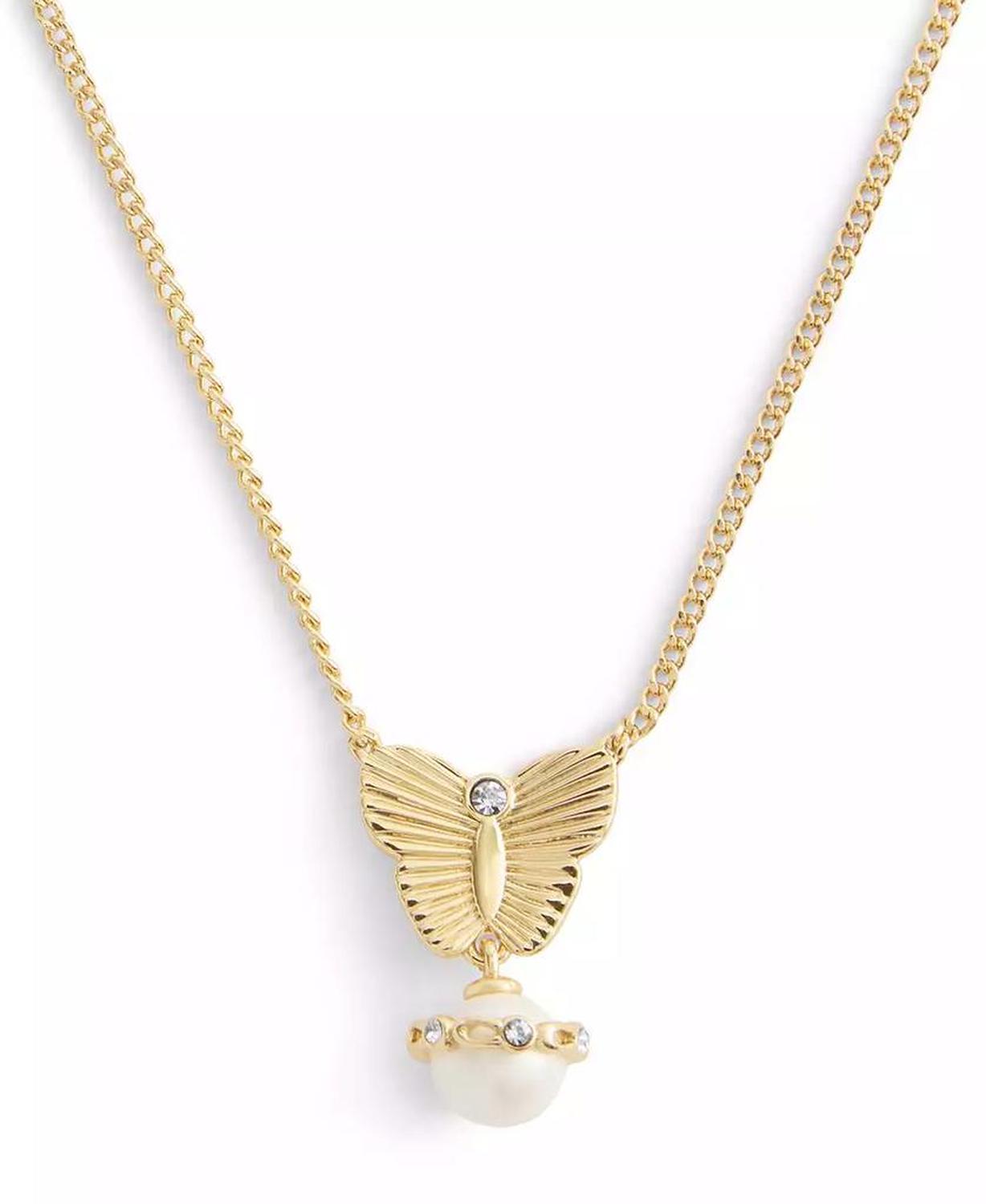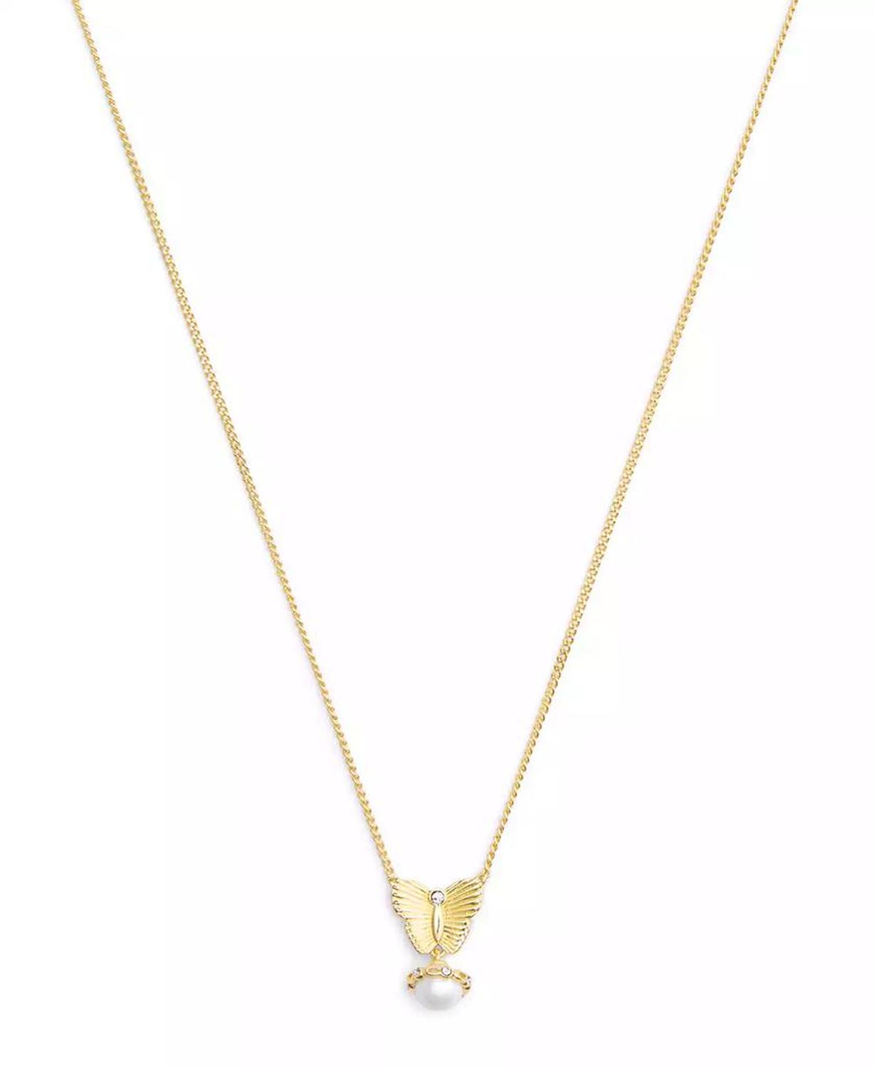 Refined chain necklace featuring textured butterfly pendant paired with delicate cultivated pearl haloed with signature sculpted C hardware and delicate stones. Set in polished gold-tone finish brass Approx. length: 16" + 2" Extender Approx. pendant drop: 3/4" Approx. pendant width: 1/2" Lobster clasp closure Chain type: Link Faux stone made of glass; Faux cultivated pearl made of glass Includes signature COACH jewelry dustbag. wipe clean Imported