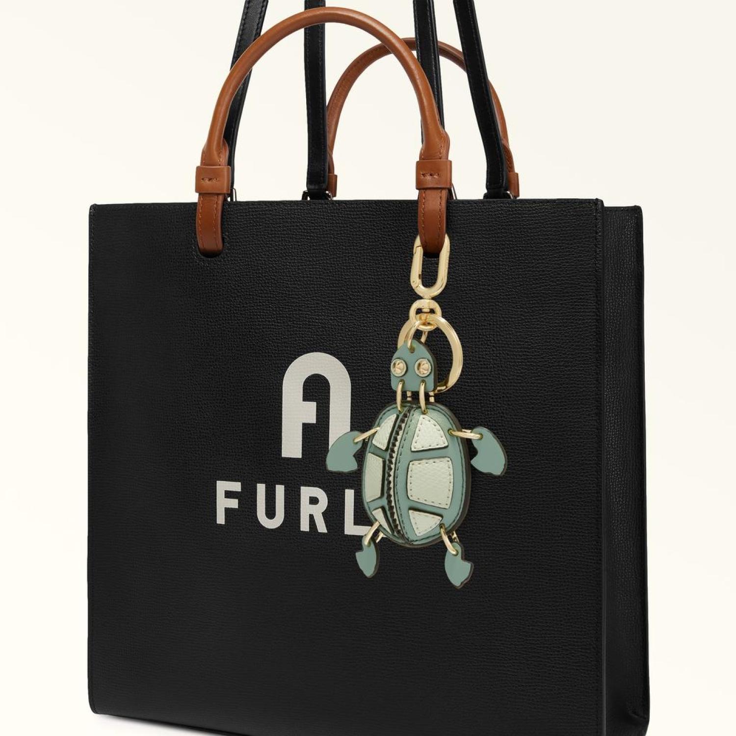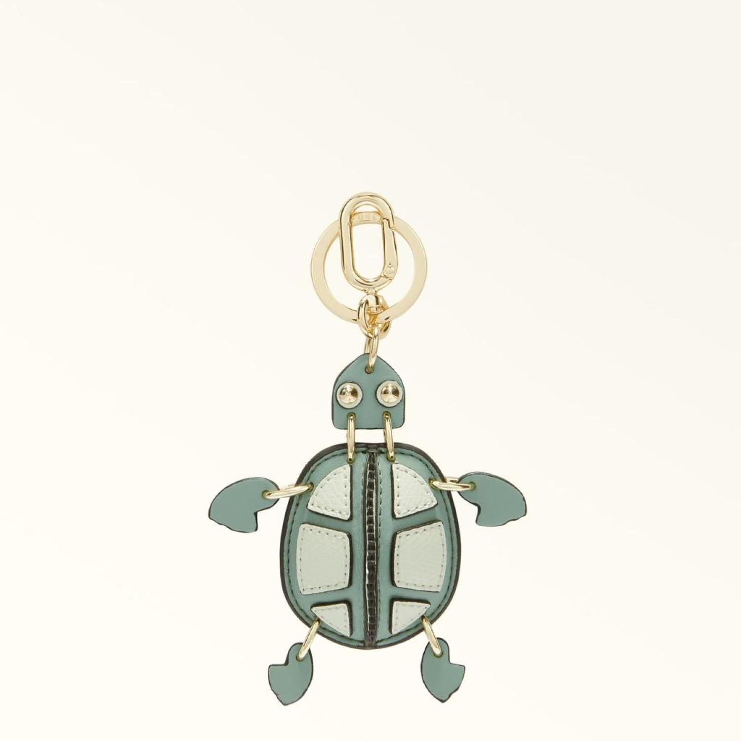 • This Furla Allegra turtle keyring features a flexible design with a snap hook and brisé ring to attach it to bags. In printed leather with a grained finish and contrasting details in soft nappa leather, the head and feet are jointed, and the studs for the eyes add that extra appealing detail.