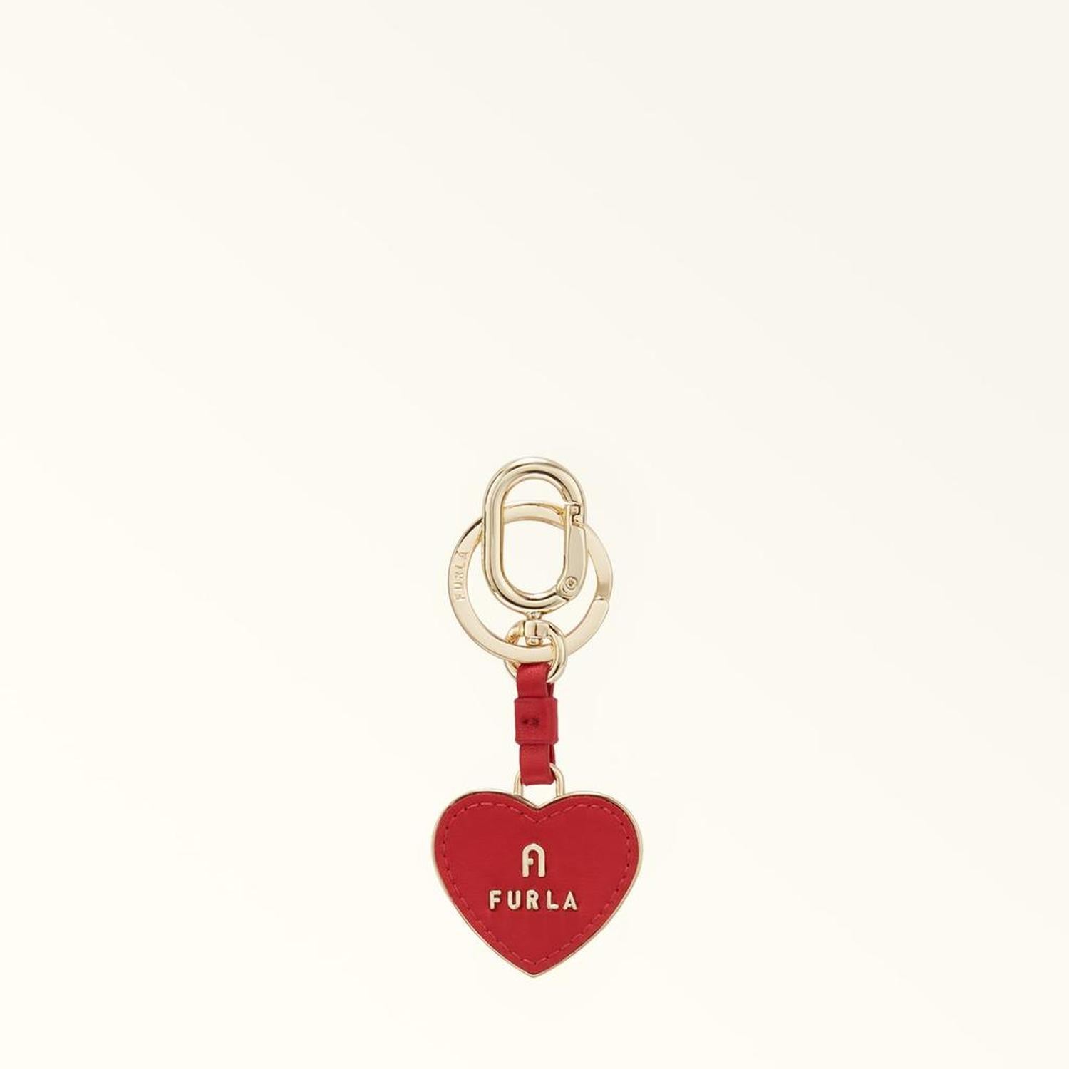 • The Furla Camelia keyring comes in a romantic metal heart shape covered in smooth fine leather, embellished with the brand's signature and the Furla Arch logo in the centre. Featuring a snap hook and ring, it can easily be attached to your bags, accessories and keys.