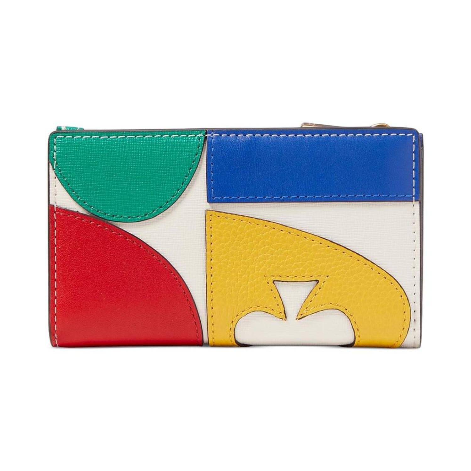 Playful with a mod vibe, this wallet by kate spade new york makes organization a work of art. 13-4/5"W x 3-1/10"H x 1/2"D; 1.1 lbs. approx. weight Snap closure Gold-tone hardware 8 interior card slots, 2 slip pockets, 1 zip pocket & ID window Leather Spot clean Imported