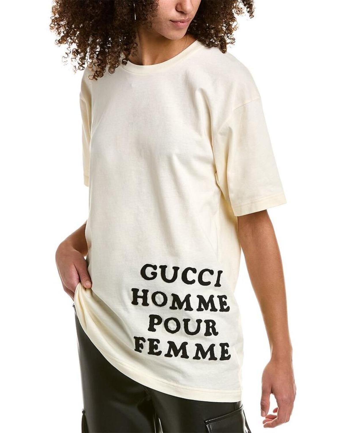 • Introducing the Gucci Oversized T-Shirt, a must-have addition to your wardrobe this season. This cream-colored t-shirt features a classic crewneck and raised embroidery, giving it a touch of luxury. Made in Italy from 100% cotton, this oversized t-shirt is both comfortable and stylish. Whether you pair it with jeans for a casual look or dress it up with a skirt, this Gucci t-shirt is versatile and chic. Embrace Italian luxury redefined with this statement piece from the eclectic and coveted brand. Don't miss out on this timeless piece that will elevate any outfit. Model is 5'9.5 and is wearing a size XXX-Small. Please note that measurements may vary slightly by size. Hand wash recommended. Our products are 100% genuine, and we stand by the authenticity of every product sold on our site.