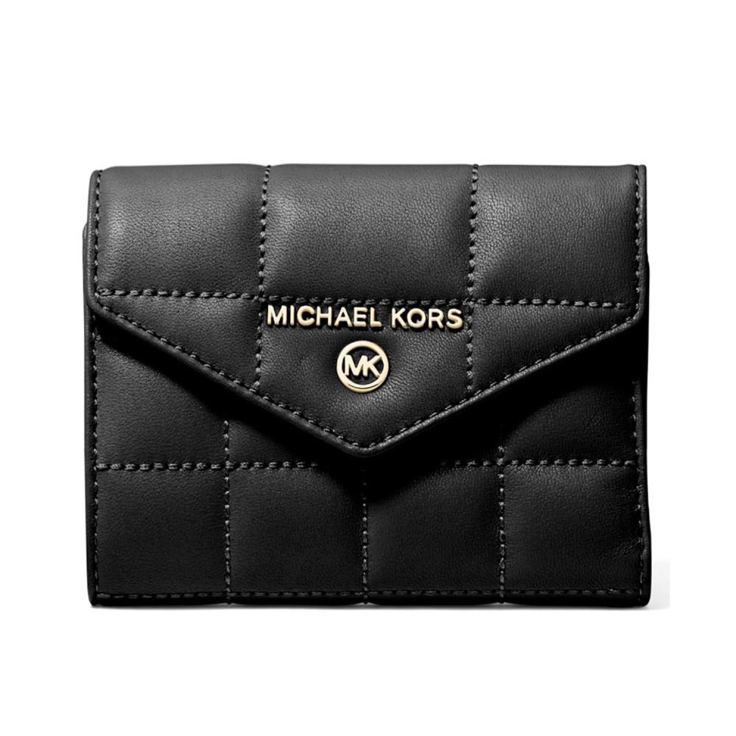 Keep things classic and always organized with this rich leather wallet from the Jet Set Charm collection by Michael Michael Kors. 4-3/4"W x 3-3/4"H x 1-1/2"D; 0.10 lbs. approx. weight Flap with snap closure Gold-tone exterior hardware and back zip pocket 3 interior slip pockets, 3 credit card pockets, window pocket Body/Trim: Leather; Lining: Polyester Imported
