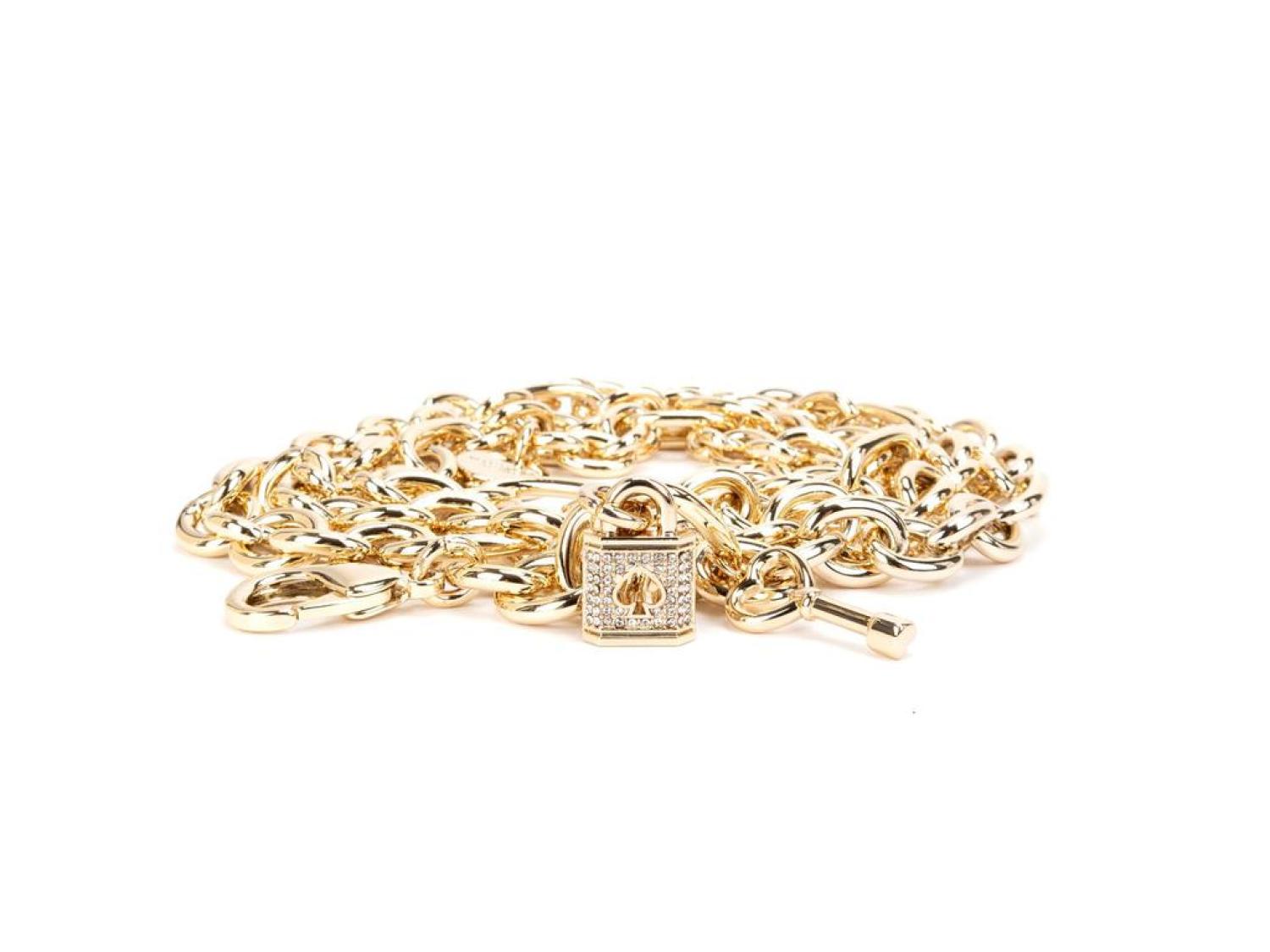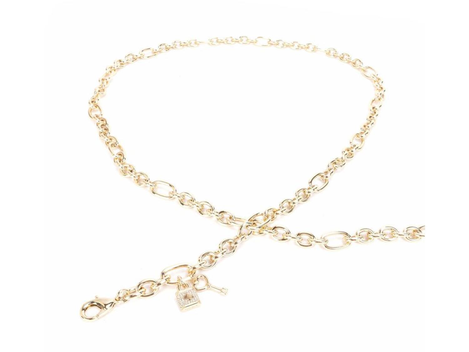Add a charming elegance to your glamorous looks wearing the Kate Spade New York® Lock And Key Chain Belt. It features a chain link design with the iconic lock and key charm. Crafted from brass. Goldtone finish. Lobster clasp closure. Imported.