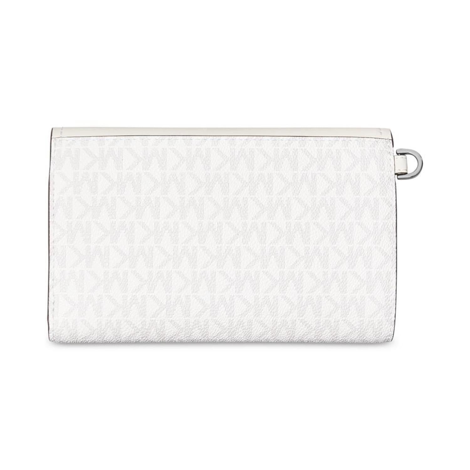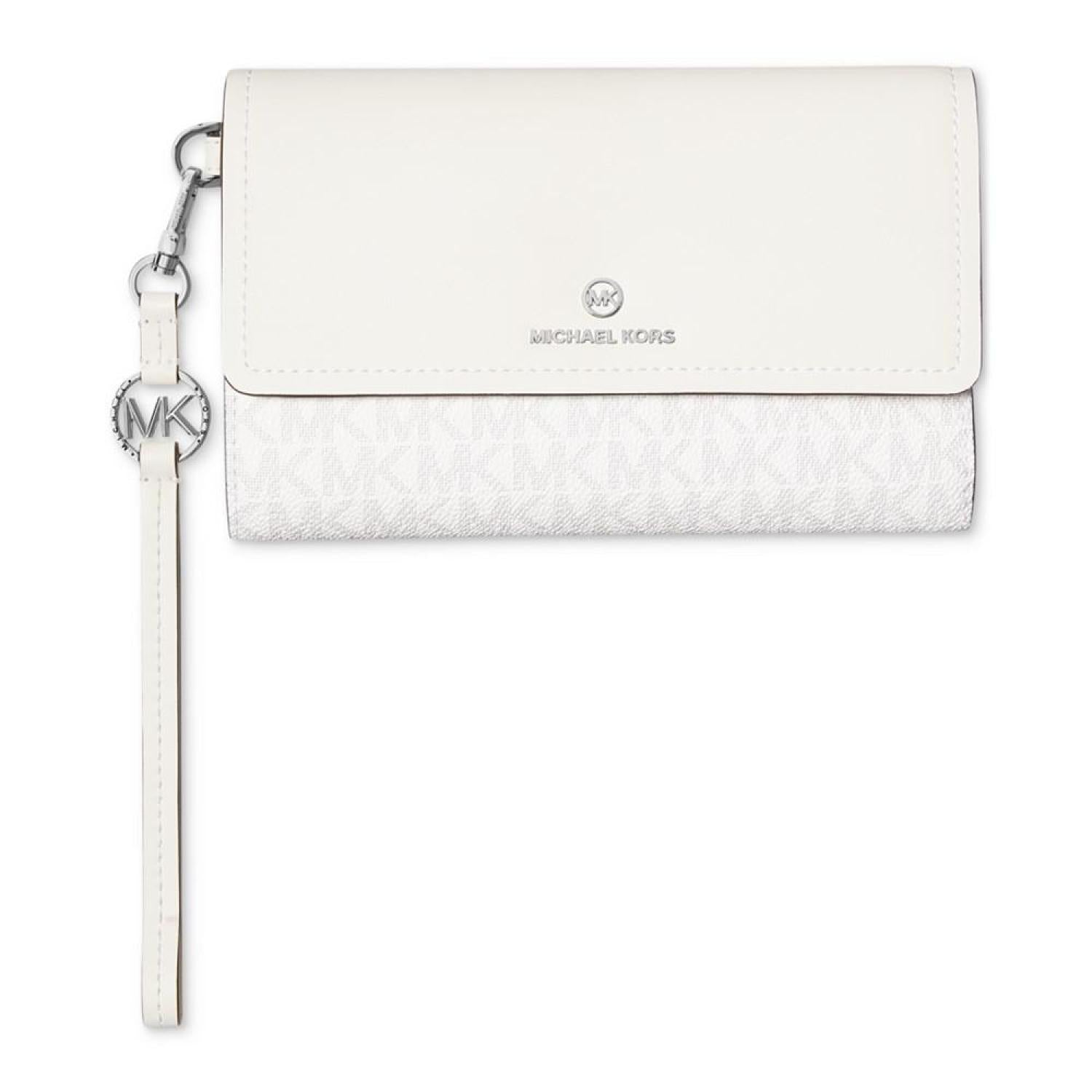 MICHAEL Michael Kors Jet Set Charm Flap Wristlet Mini sized bag; 7.5"W x 5"H x 1.75"D (width is measured across the bottom of handbag); 0.53lbs. approx. weight Silhouette is based off 5'9" model 8.5"L strap Snap closure Interior 1 back zip pocket, 6 back credit card pockets, 1 front id window pocket, 1 bill compartment, 1 front tech pocket Polyvinyl chloride/polyester/polyurethane Spot clean Imported