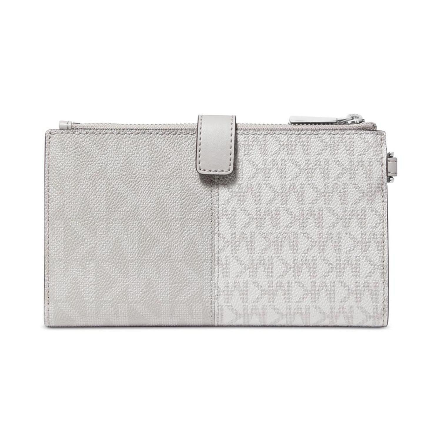 MICHAEL Michael Kors Jet Set Wristlet Mini sized bag; 7.25"W x 4"H x 1.5"D (width is measured across the bottom of handbag); 0.24 lbs. approx. weight Zip closure, magnetic snap closure Exterior 2 top zip pockets Interior 6 credit card pockets, 1 window pocket, 1 phone pocket, 3 slip pockets 89.4% Pvc, 9.6% Polyester, 1% Pu Spot clean Imported
