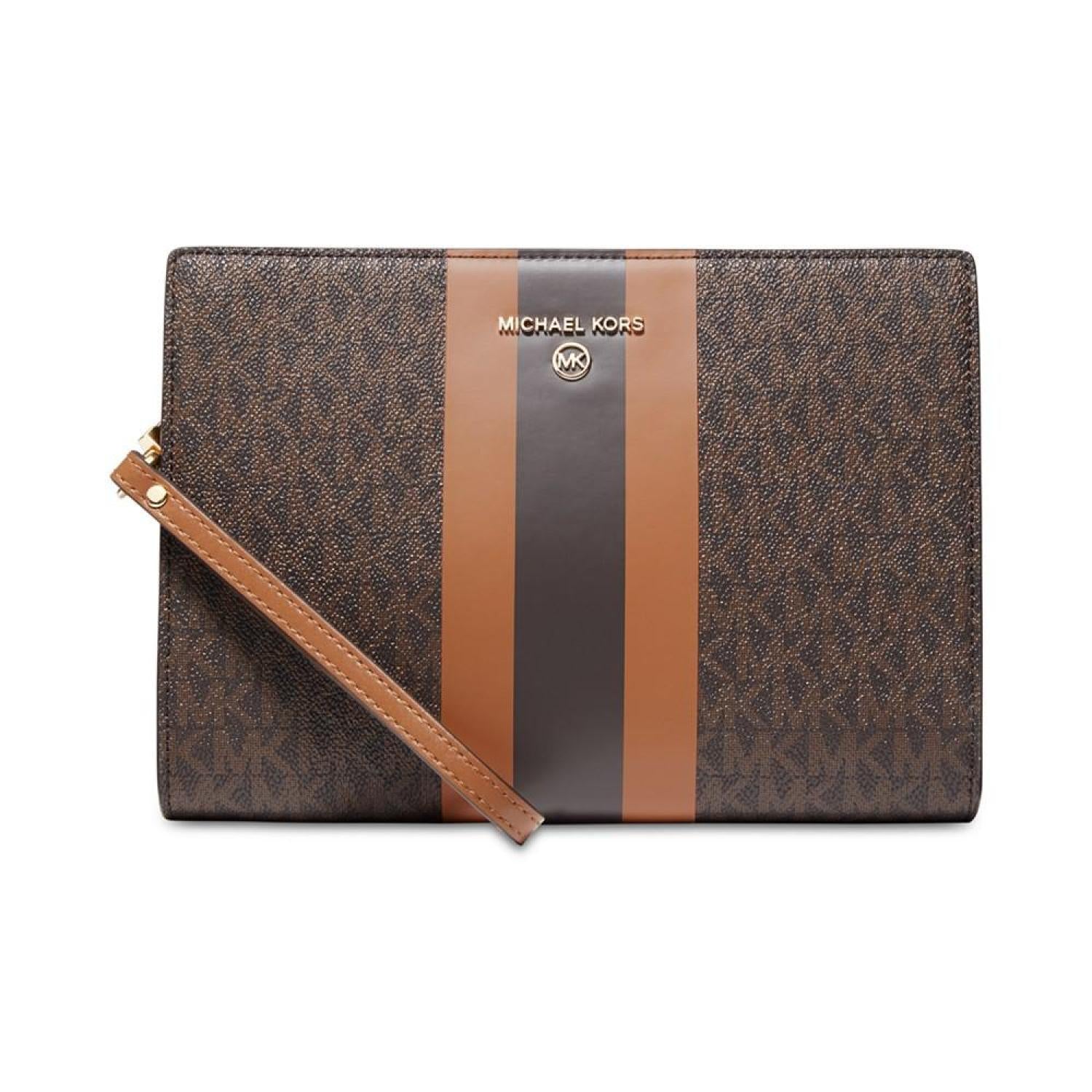 Michael Michael Kors Women's Travel Accessories Travel Wristlet Pouch Material; Body- polyvinylchloride, polyester, cotton, polyurethane, lining- polyester, trim- genuine leather Small sized bag; 9.75" W x 7.5" H x 2" D Snap closure 1 back slip pocket, 6 back credit card pockets Weight- 0.55 lbs Polyvinyl chloride Wipe clean Imported