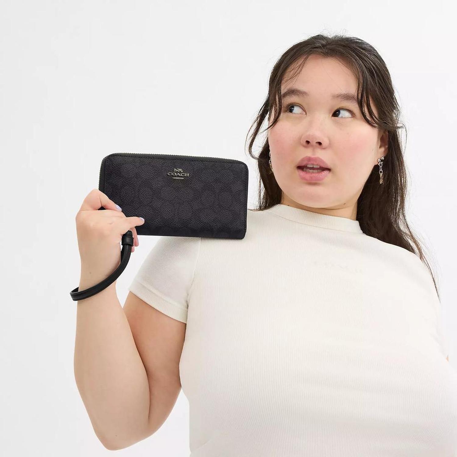 Signature coated canvas 12 credit card slots Full-length bill compartments Inside zip coin pocket Zip-around closure Detachable wrist strap 7 1/2 (L) x 4 (H) x 1 (W) Fits all iPhone and Samsung Galaxy phones Style No. CW778 | Coach Outlet Long Zip Around Wallet In Signature Canvas - Multi