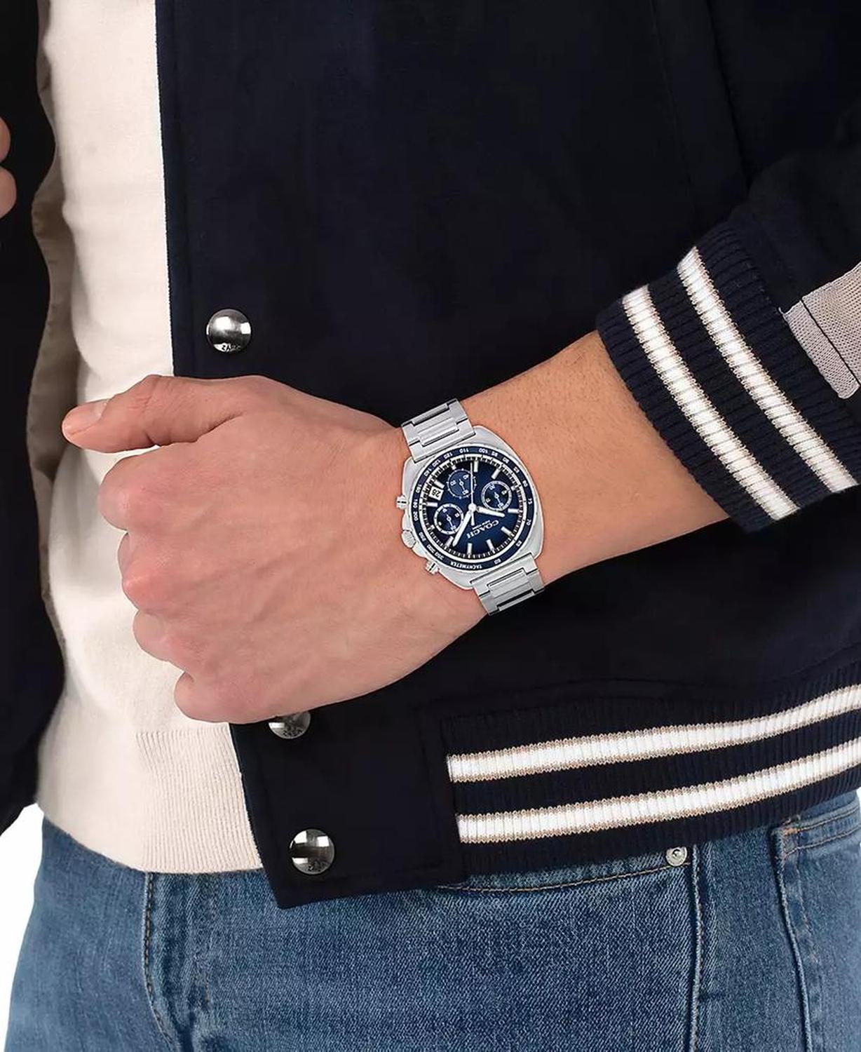 Made for adventures near and far, the Charter is a sporty multi-function style designed for life on the move. Finished with a navy tachymetric bezel, this stainless-steel chronograph bracelet watch features a navy blue ombre dial with a date window and three sub dials marking seconds, minutes and hours. SKU 14602737 Dial: Blue Movement: Chronograph Case: Tonneau, Stainless Steel and Blue Aluminum; 39m Strap: Stainless Steel Bracelet with Push-Button Deployment closure Water Resistance up to 30 meters Watch comes in a box Spot clean Imported