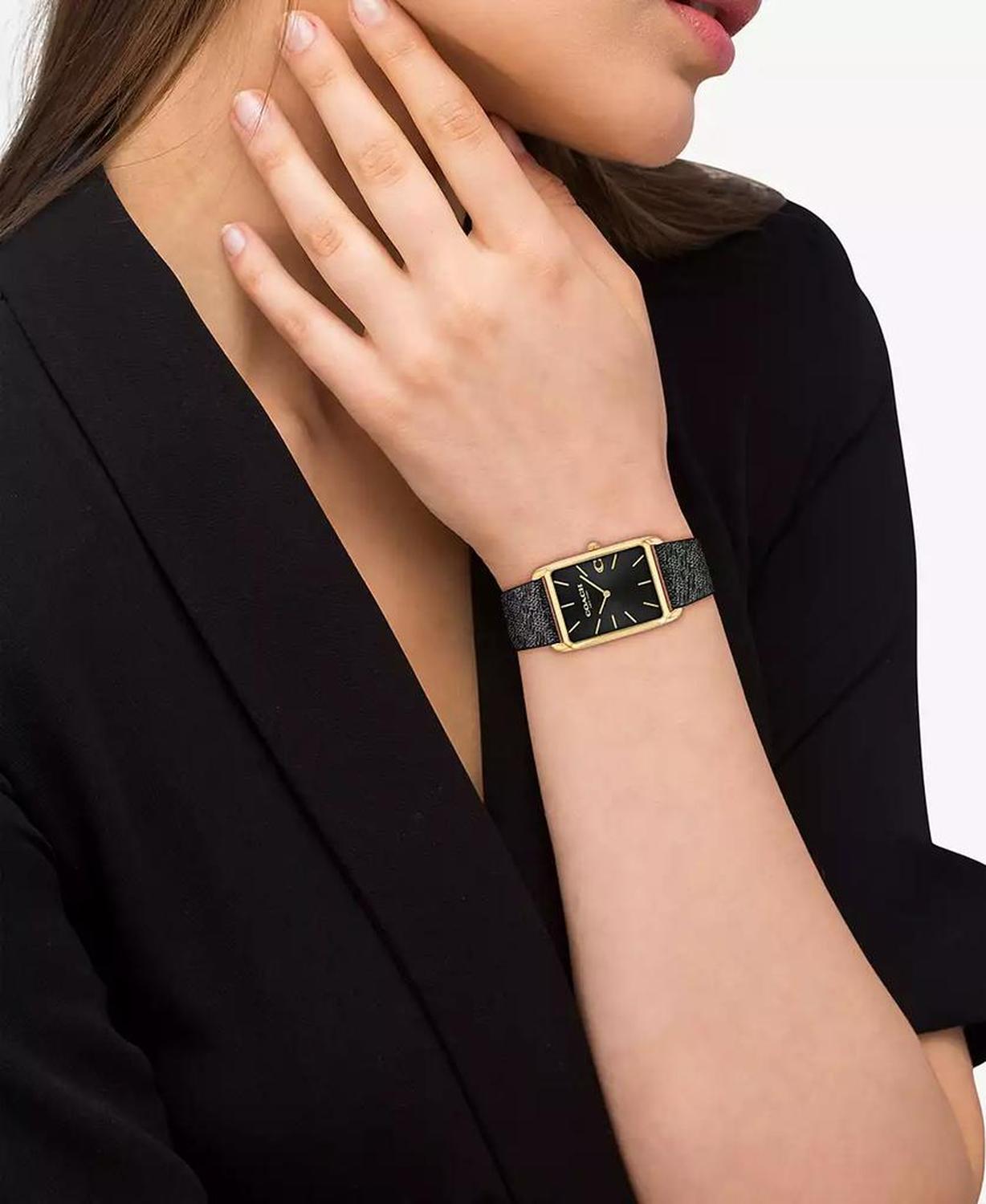 • With clean lines and a modern minimalist sensibility, the Elliot is a true design classic ready for workdays and weekends. Finished with a black Coach Signature canvas strap, this gold tone tank watch features a black sunray dial detailed with stately stick markers and the Coach Signature at 3 o'clock. SKU# 14400045