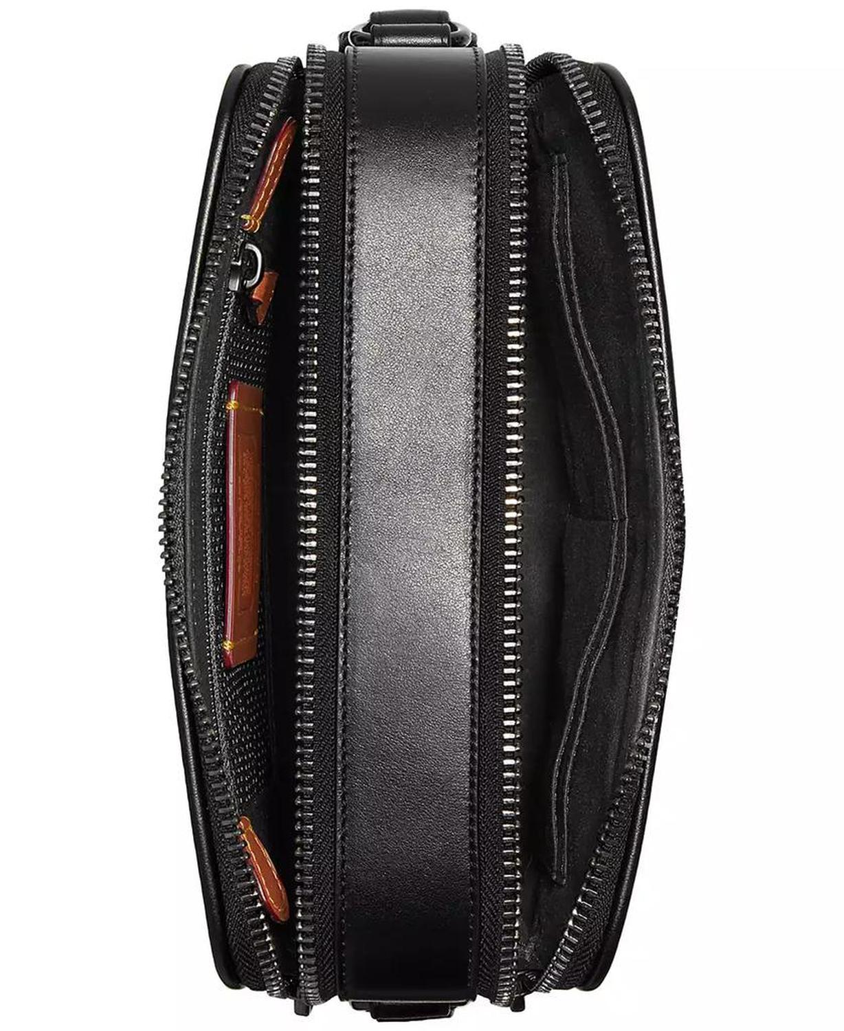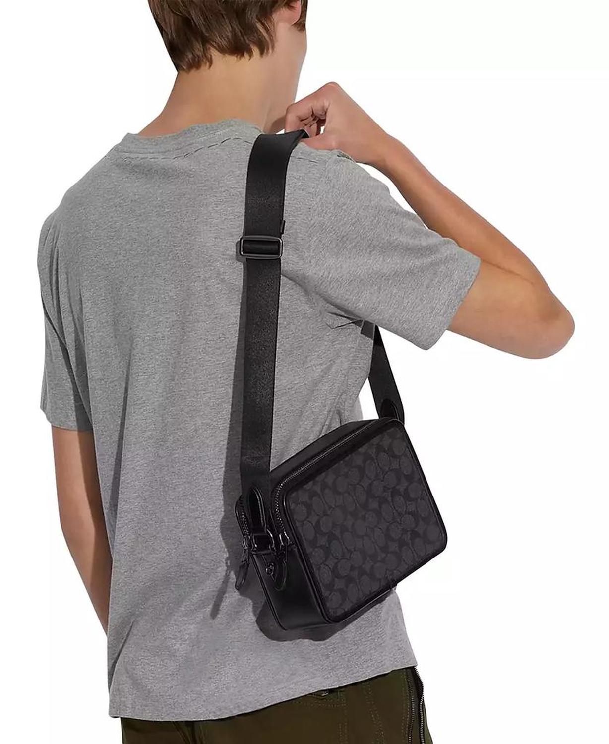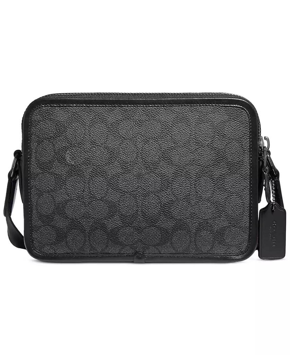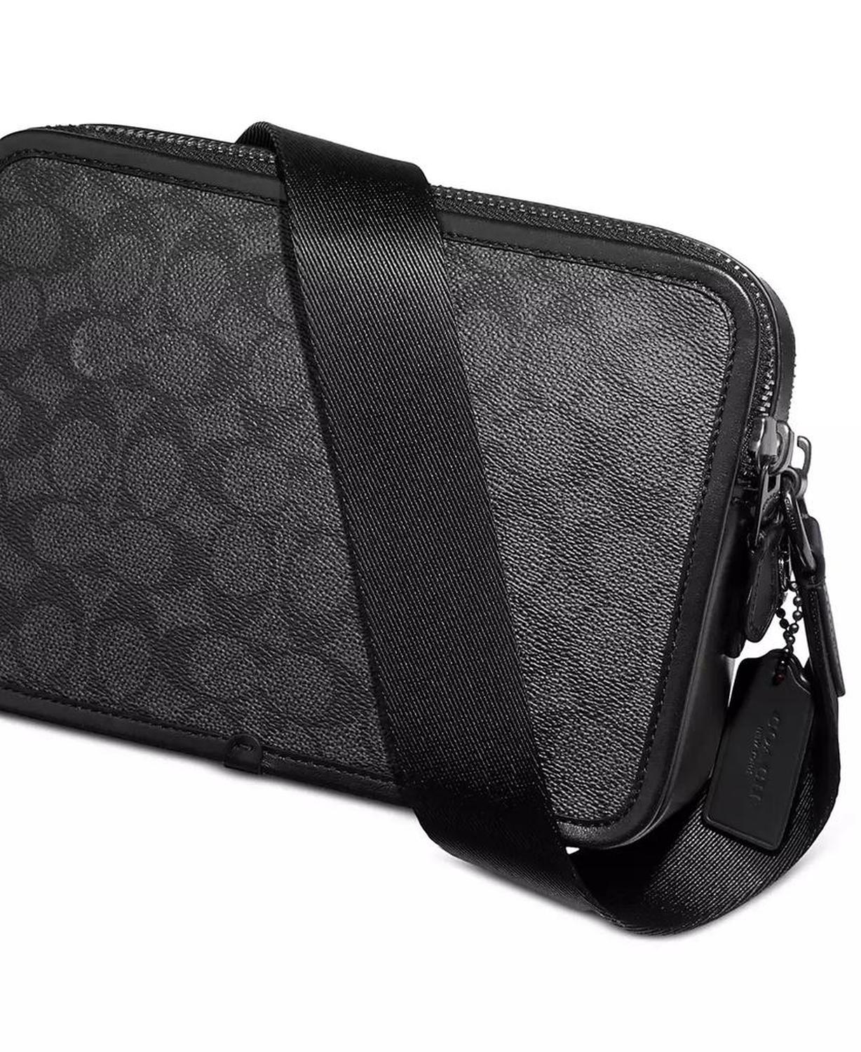 A signature look with refined leather trim, this COACH bag keeps your essentials organized and your look polished. The adjustable strap offers shoulder or crossbody carrying options. Approx. dimensions: 9-1/2"L x 6-1/2"H x 2-3/4"W Adjustable strap; approx. drop: 21-3/4" Double-zip closure Signature coated canvas exterior with logo print and leather trim Lined interior with zip pocket and four card slots Shell: 55% polyvinyl chloride, 45% leather; lining: 75% polyvinyl chloride, 20% polyester, 5% cotton Spot clean Imported