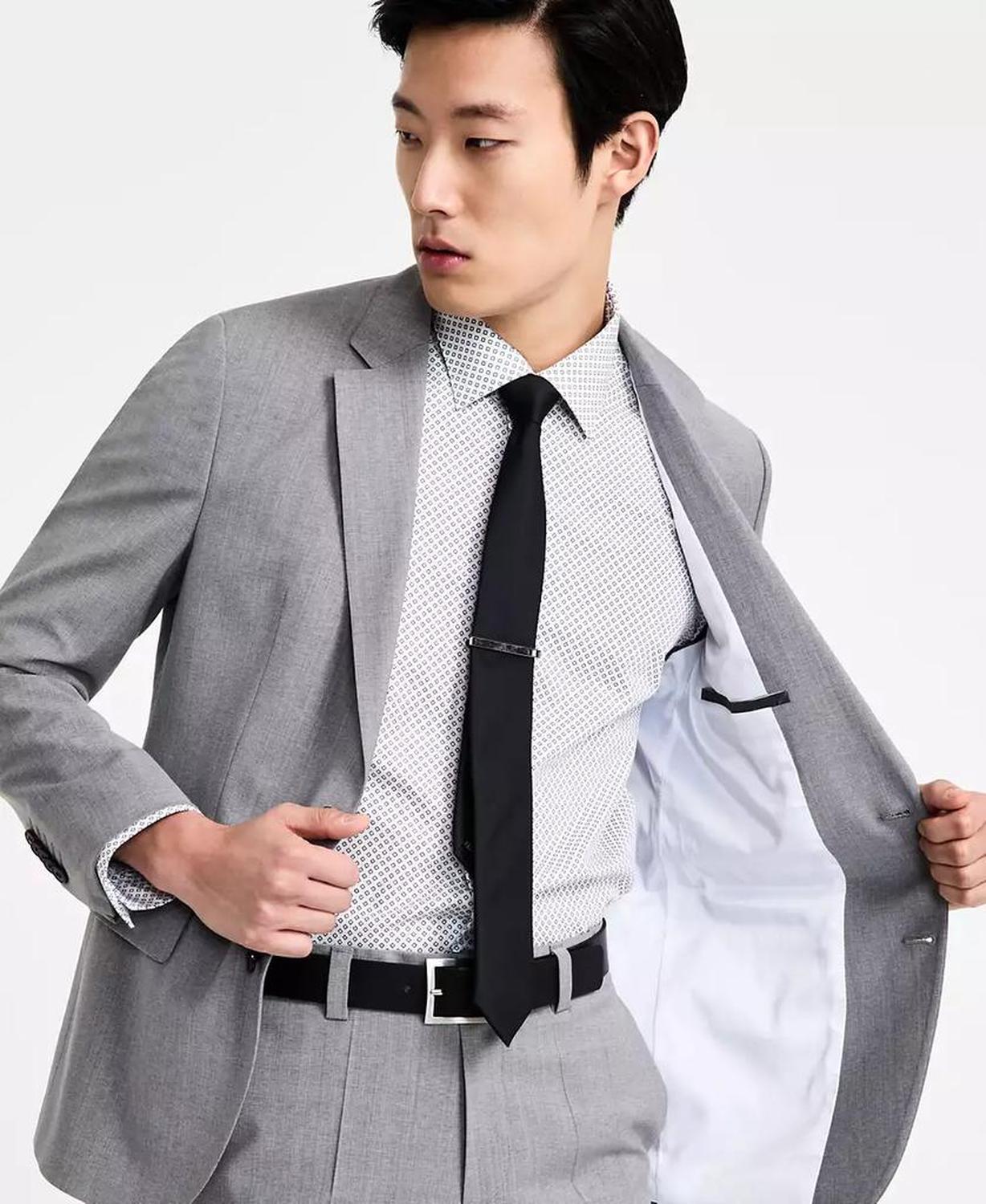 Walk with a one-two punch of confidence and elegance when you enter your next formal event in this modern-fit jacket from HUGO by Hugo Boss. Modern fit Notched lapels Button closure Two buttons Kissing buttons at the cuff Flap pockets Welt pocket at chest Side vent Fully lined Shell: 74% wool, 22% polyester, 4% elastane; lining: 100% polyester Dry clean Imported