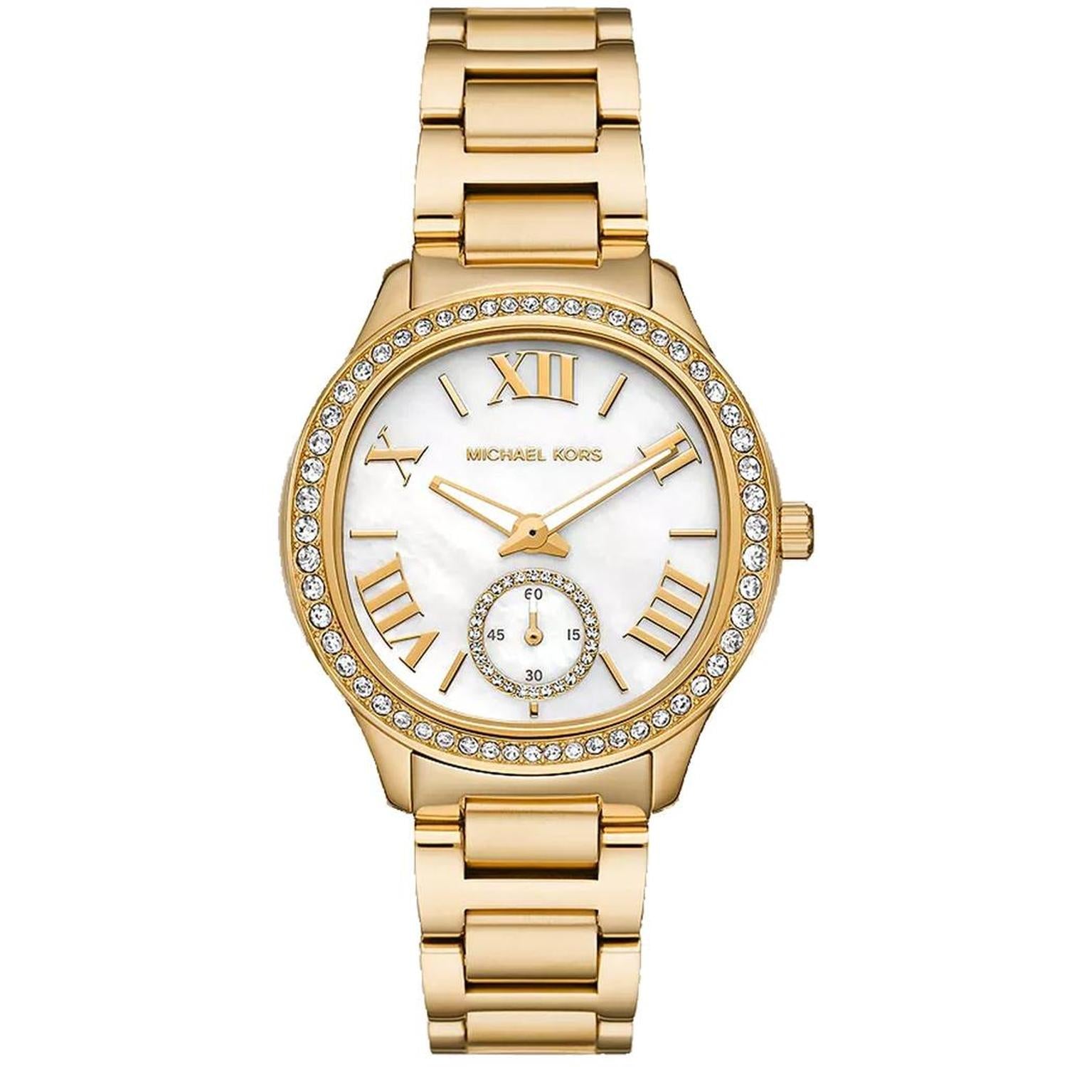 • Stainless steel case, Stainless steel bracelet, White dial, Quartz movement, Scratch resistant mineral, Water resistant up to 5 ATM - 50 meters - 165 feetSpecification - Gender - Women Dial Color - White Band Color - Gold Case Diameter - 38mmmm Bracelet or Strap Width - 18mmmm Band Material - Stainless steel Crystal Type - Mineral Crown Type - Push/pull Clasp Type - Foldover Movement - Quartz