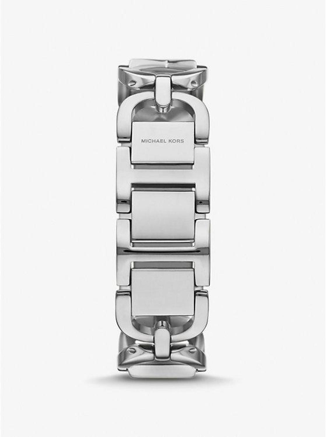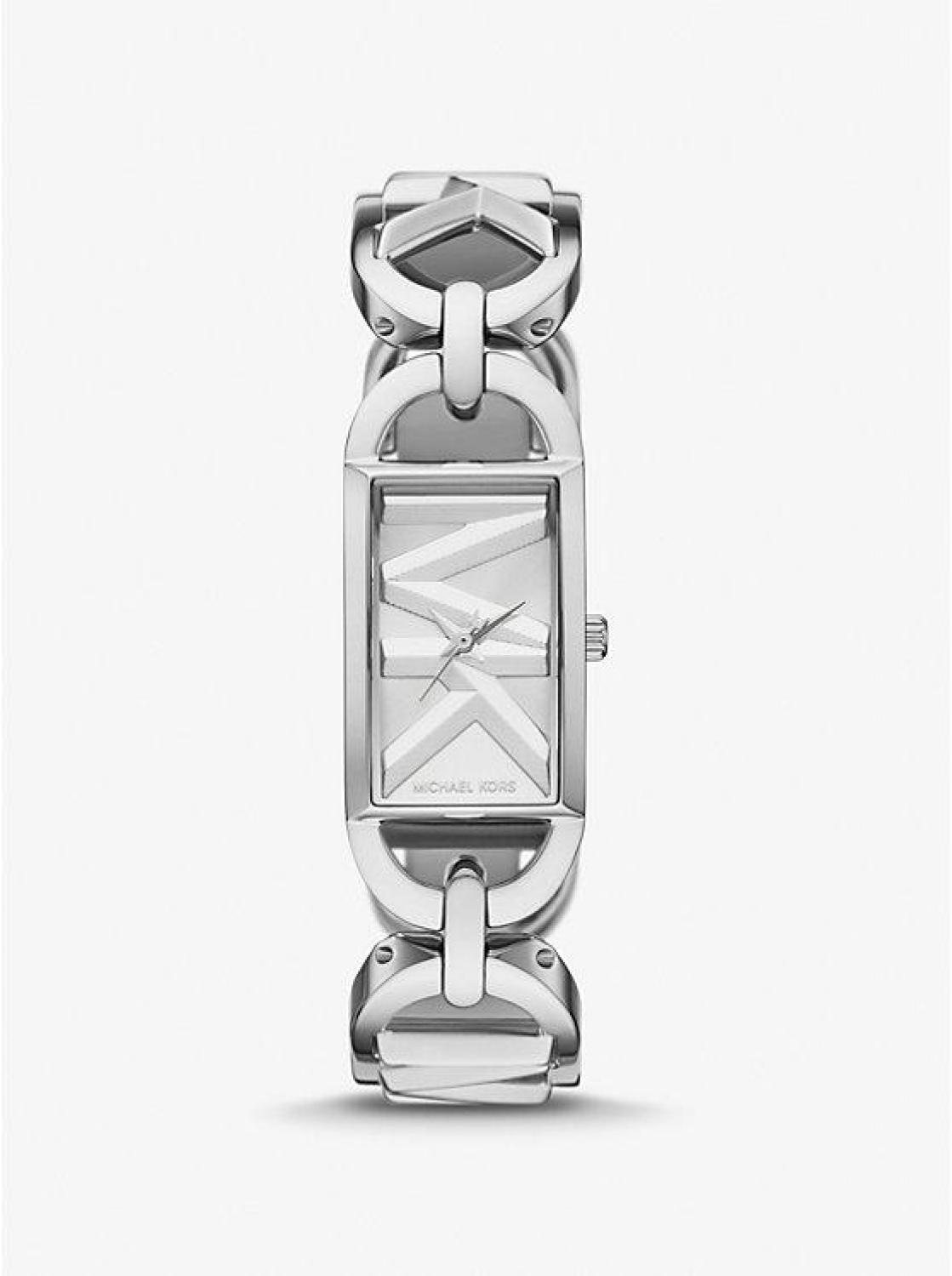 • This elegant iteration of the Empire timepiece pays homage to big-city glamour with its minimal, Art-Deco-inspired design. Animated by a quartz movement, this petite watch features a stainless steel case with a logo-faceted dial. Match your earrings and necklaces to the polished silver-tone bracelet.