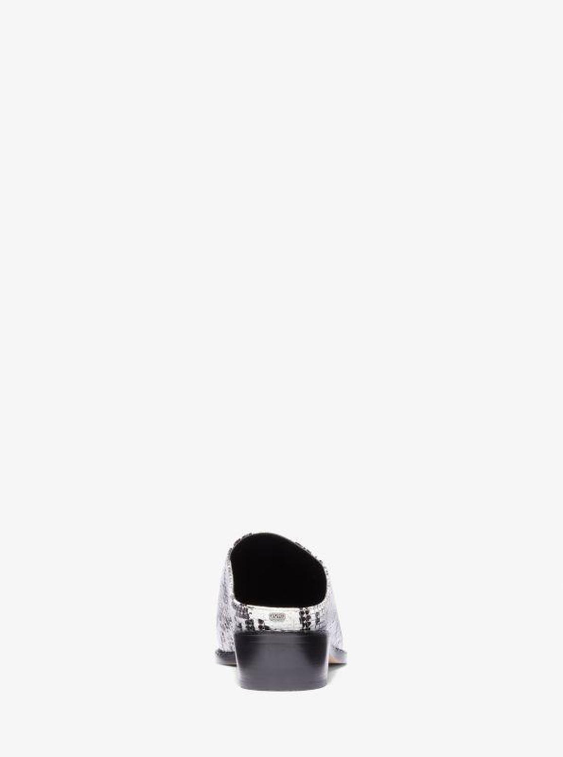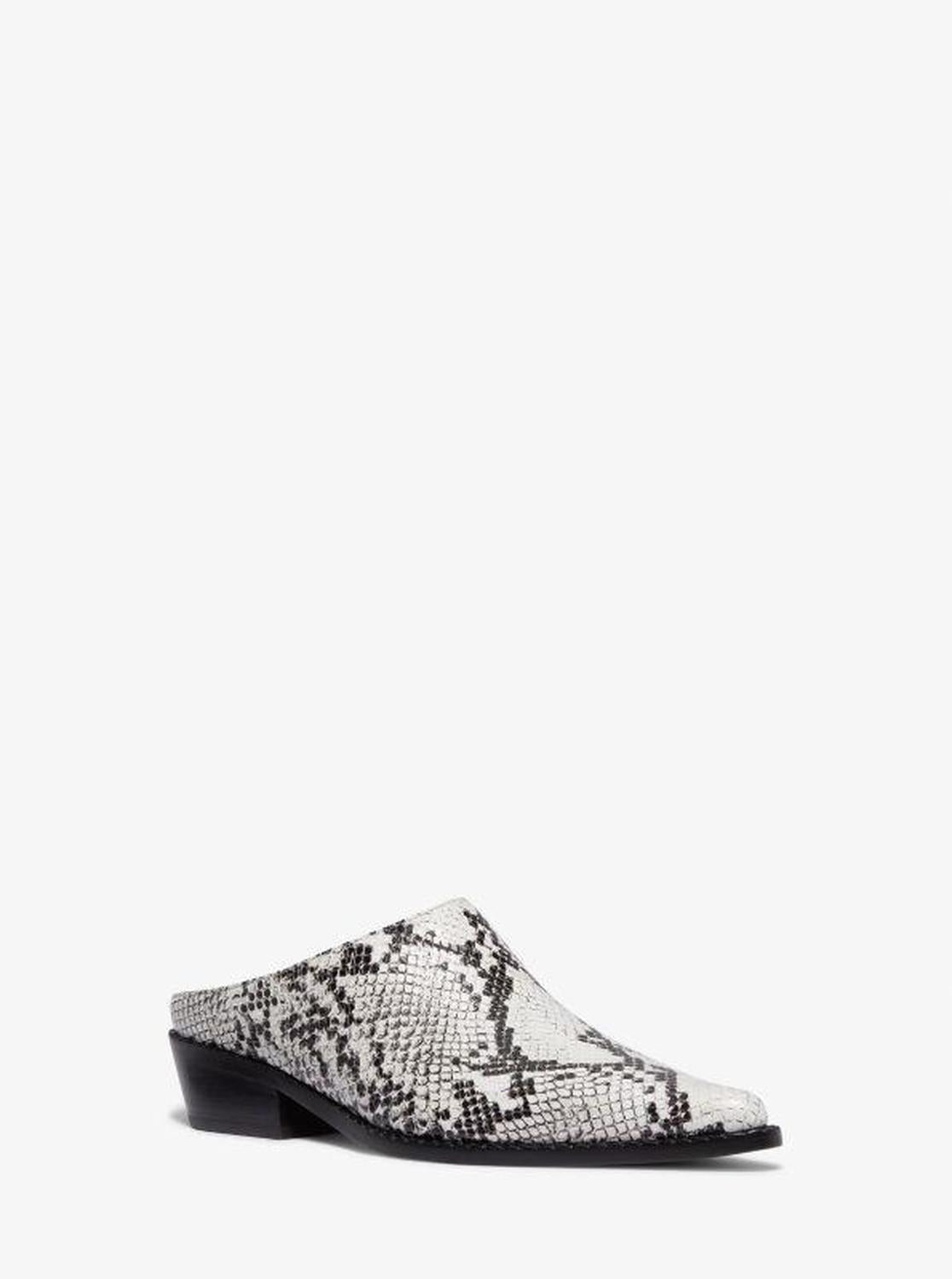 • Our Nash mule is a Western-inspired style with sleek, city-ready flair. Crafted in snake embossed leather, it features minimal detailing, a sharply pointed toe and a sturdy stacked heel. Slip it on with your favorite jeans or a breezy dress.