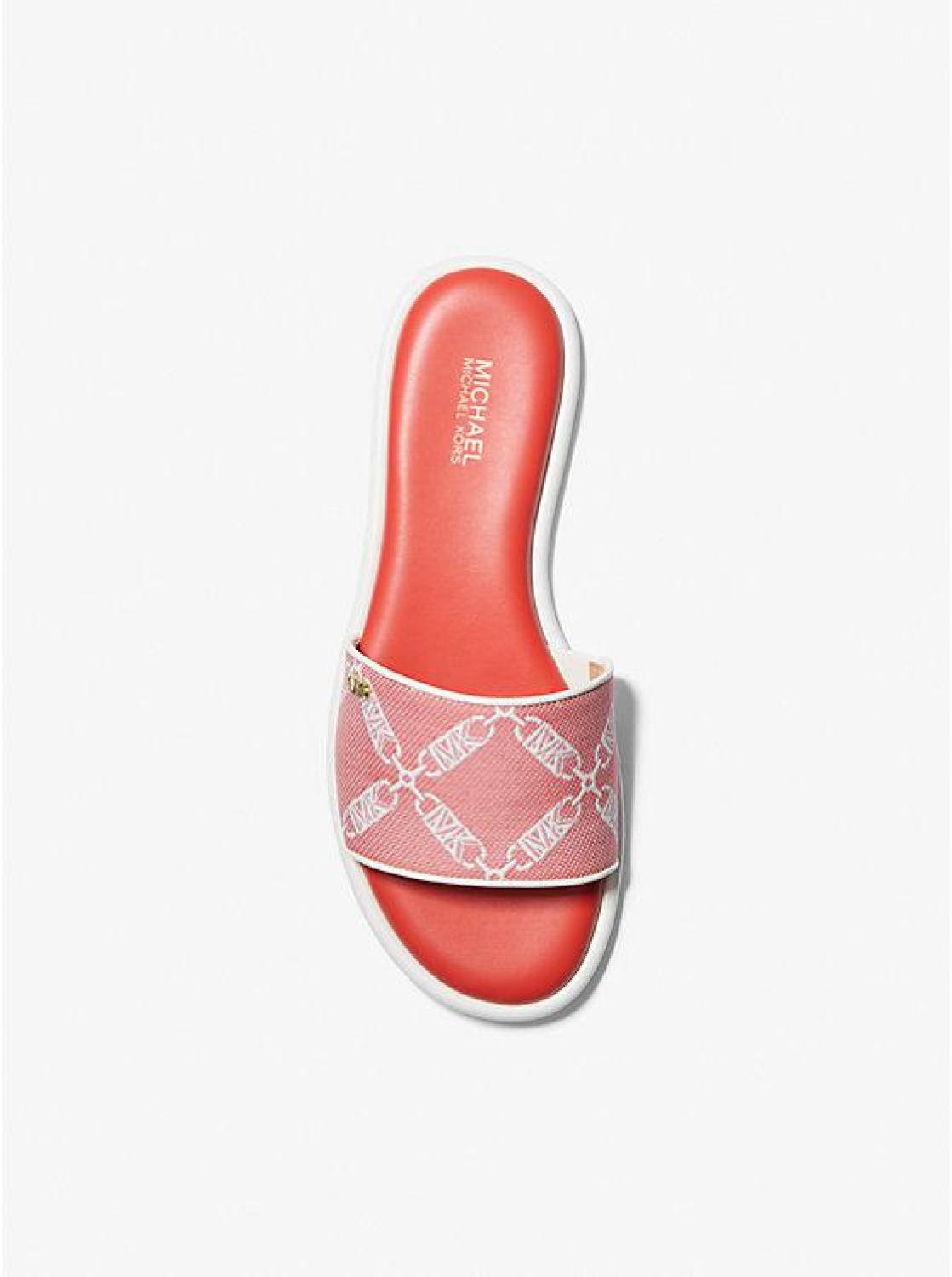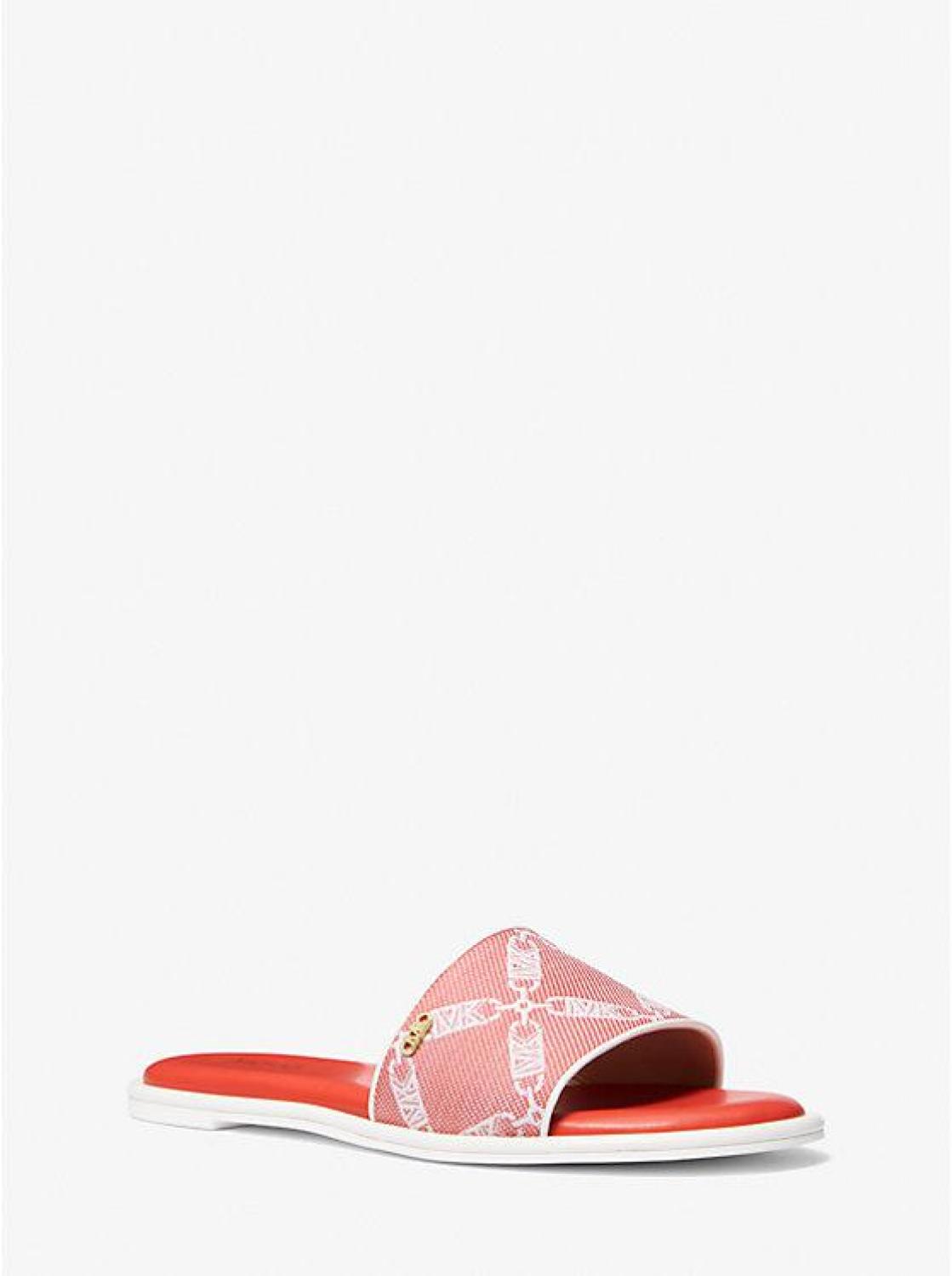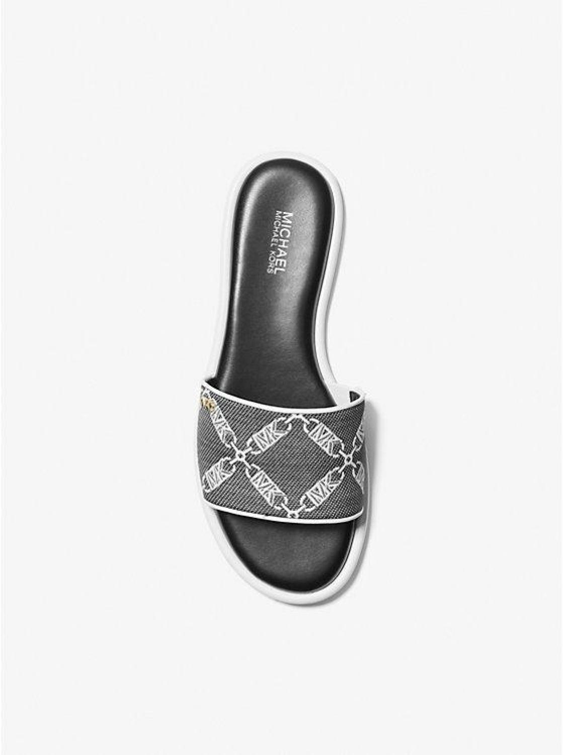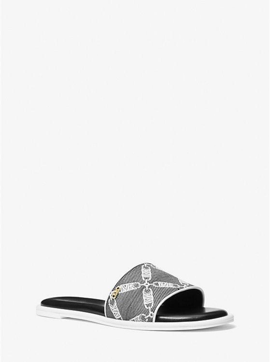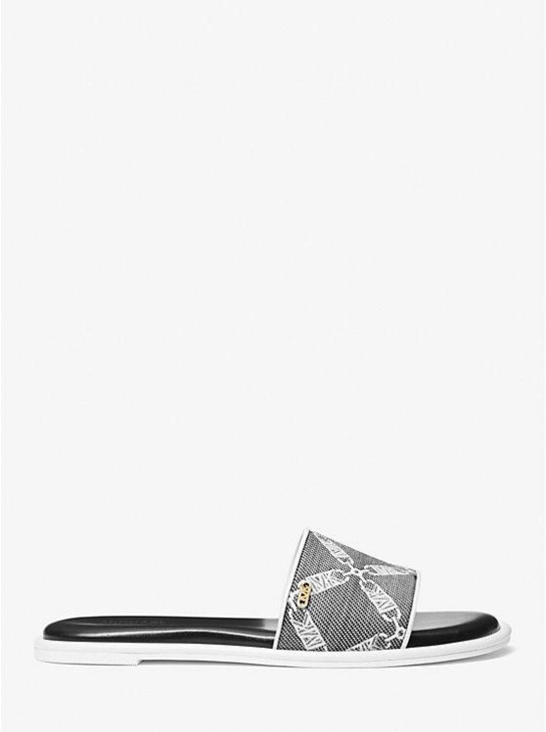 • Designed with a two-tone finish, our Saylor slides are a study in understated glamour. Featuring a streamlined profile and a woven take on our Empire Logo print, they offer an iconic touch to a plethora of ensembles.