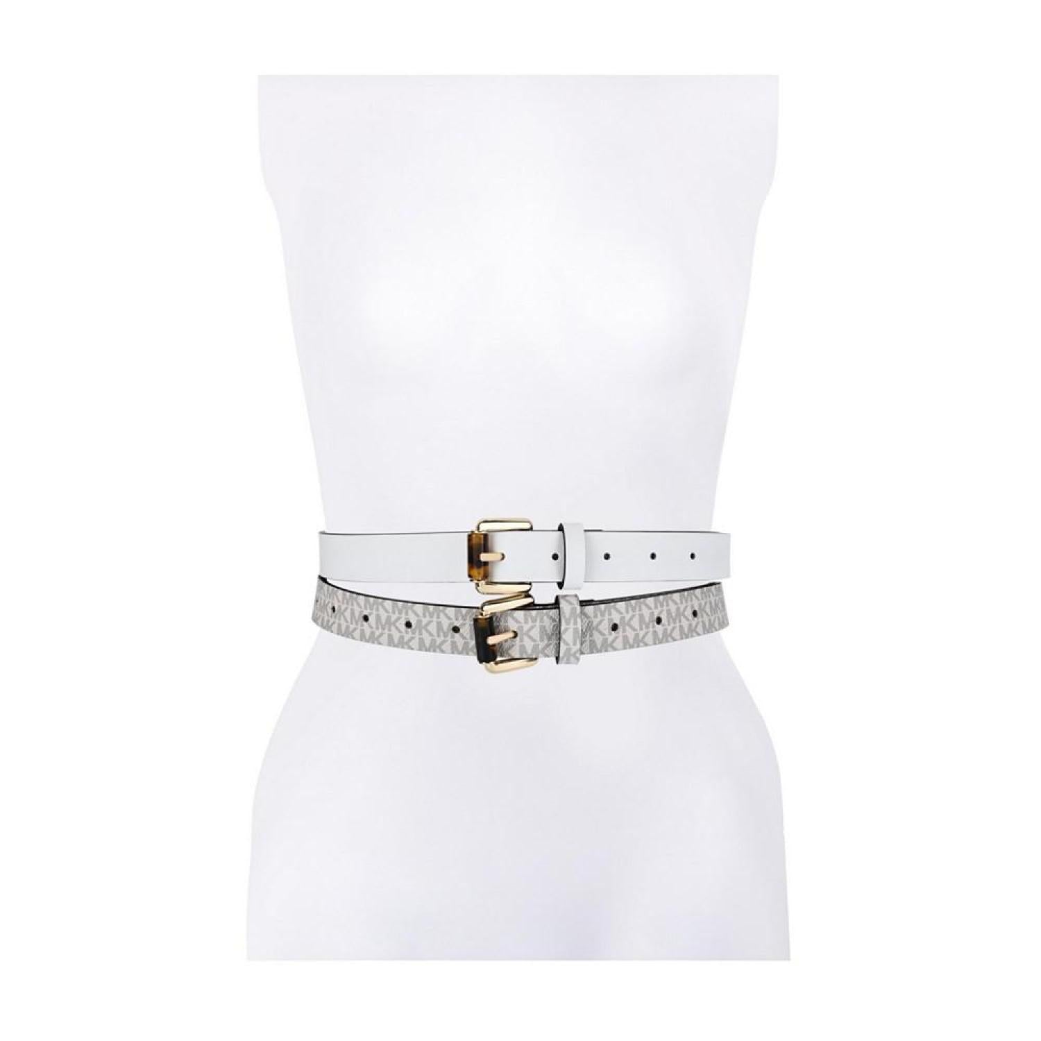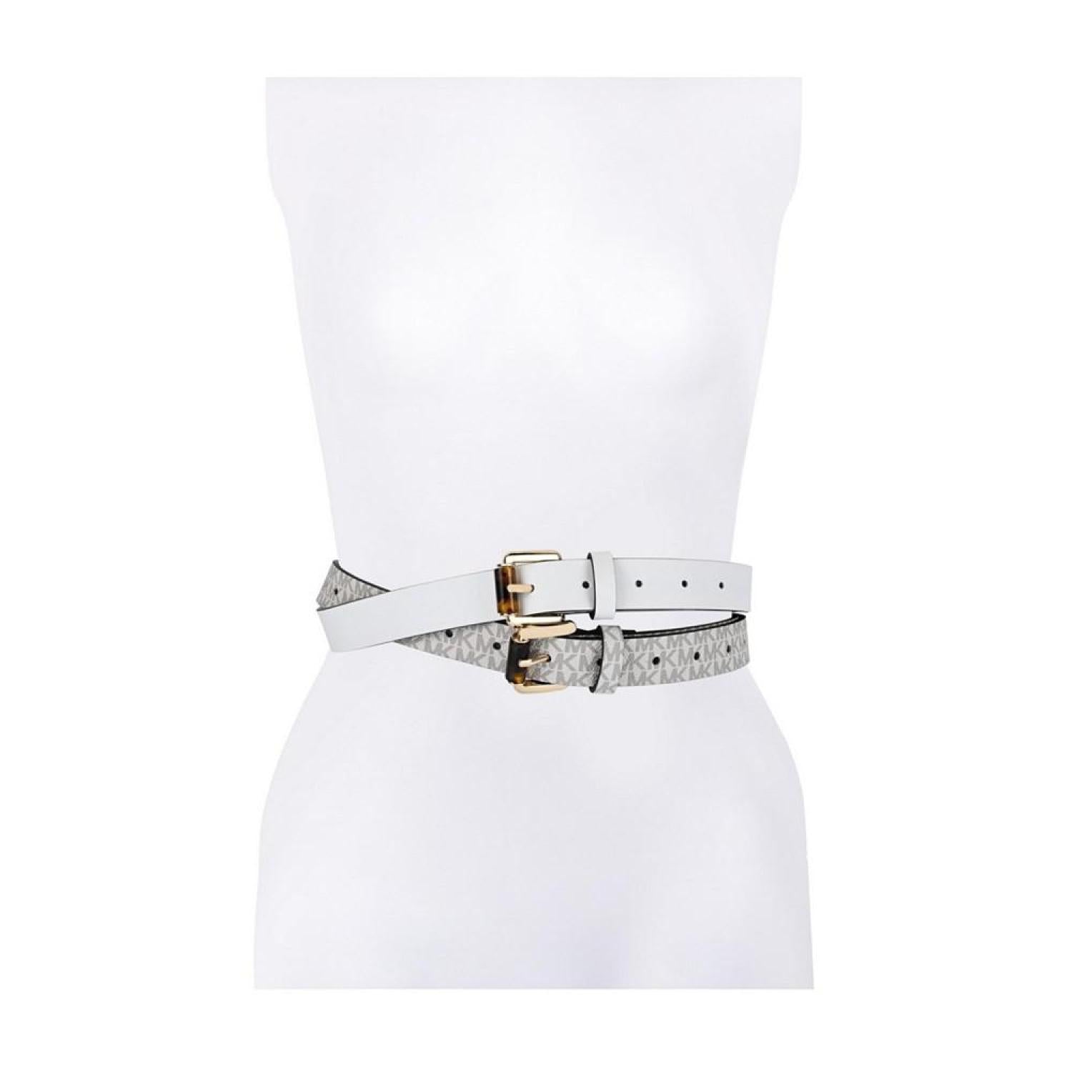 These Michael Kors 2 for 1 belts are the perfect embellishment to polish any look this summer season. Approximate width - 0.98" Approximate length - 31", 34", 37" ,40" Holes between on belt panel - 0.98" Polished gold-tone buckle Reversible colour optic white Set include - 2 belts Product weight - 0.5lbs This item purchased online must be returned to the vendor by mail only. This item cannot be returned to Macy's stores. 100% Polyurethane Spot Clean Imported