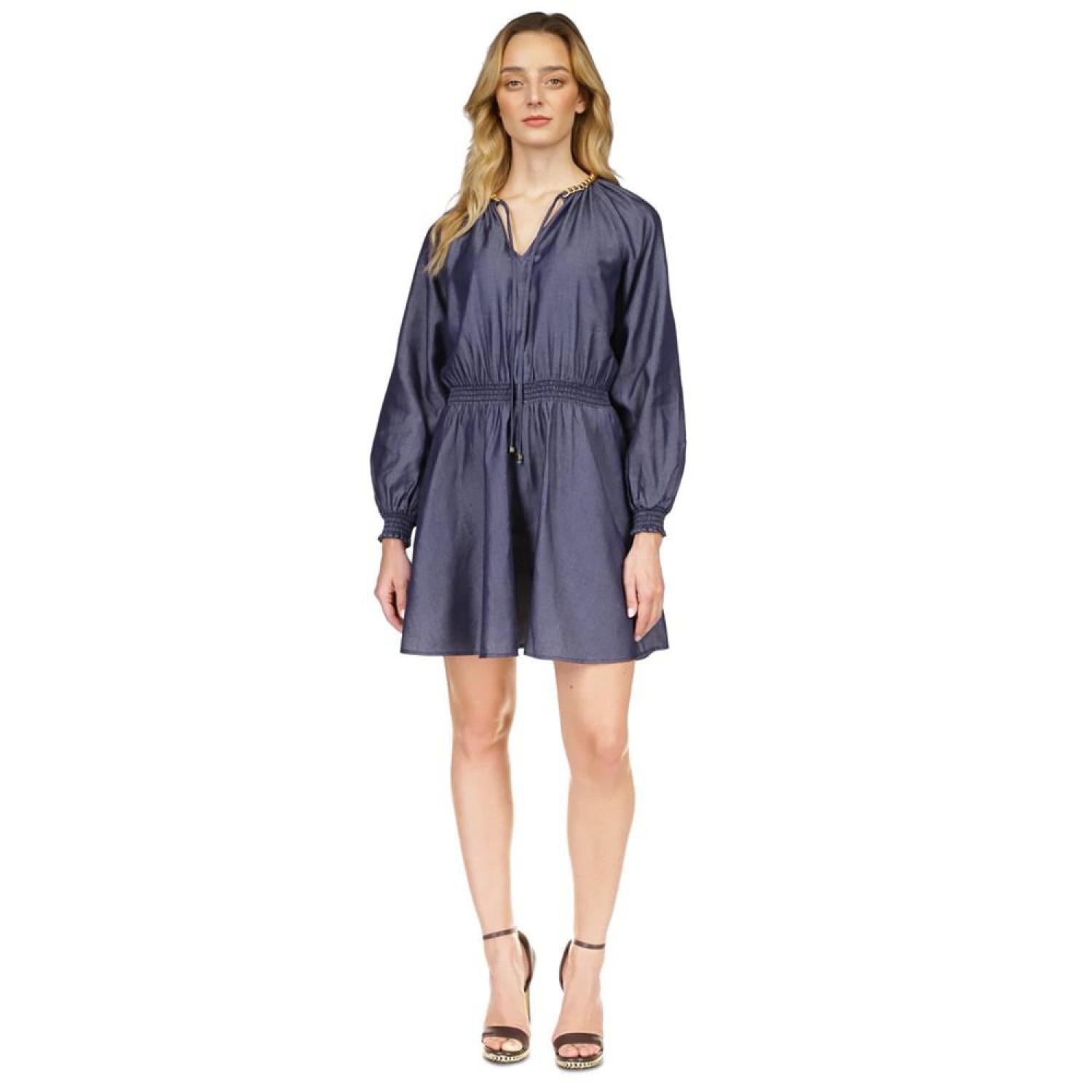 • Add a touch of feminine flair to your wardrobe with MICHAEL Michael Kors' smocked-waist, tie-neck dress. The chain-embellished neckline adds a touch of class.
