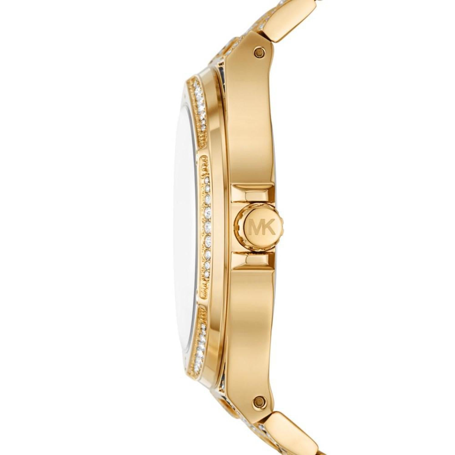 Our Lennox is effortlessly chic, with a bold animal print-inspired pave design for the season. This gold-tone stainless steel watch features a faceted pave topring, and all-over pave on the dial and bracelet with a black enamel cheetah print overlay. Style #MK7284. Movement- quartz Case- round, gold-tone stainless steel, 43mm Strap- gold-tone stainless steel, black enamel and clear pave crystal cheetah bracelet Approximate adjustable strap length- 175+/- 5mm Dial- black and gold-tone pave Closure type- bracelet deployant clasp Water resistance- up to 50 meters This item purchased online must be returned to the vendor by mail only. This item cannot be returned to Macy's stores. Imported Photo may have been enlarged and/or enhanced.