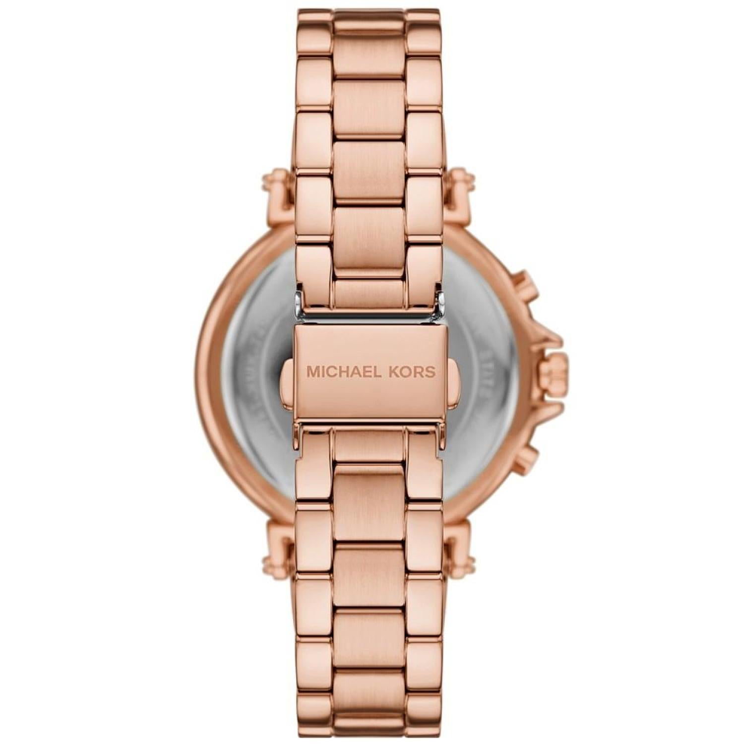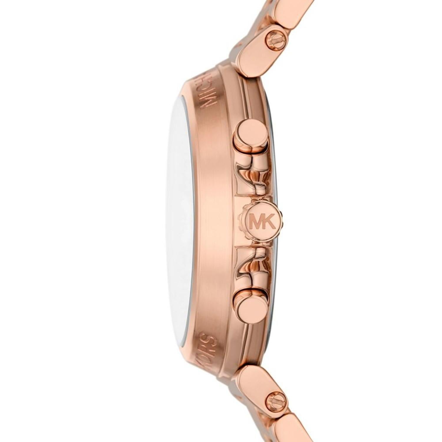 With its sleek T-Bar design, the Maren Chronograph seamlessly blends sophistication and modernity. Crafted with precision and adorned with the iconic Michael Kors logo on the top ring, it's a statement of refined style that transcends trends. Dial: Rose gold-tone, with sunray finish. Case: Round, Rose gold-tone stainless steel, 40mm Strap: Rose gold-tone stainless steel; Closure: 2 Pusher foldover clasp; Approx. Adjustable length: 175+/- 5mm Water resistant to 50 meters Movement: Quartz/chrono Imported