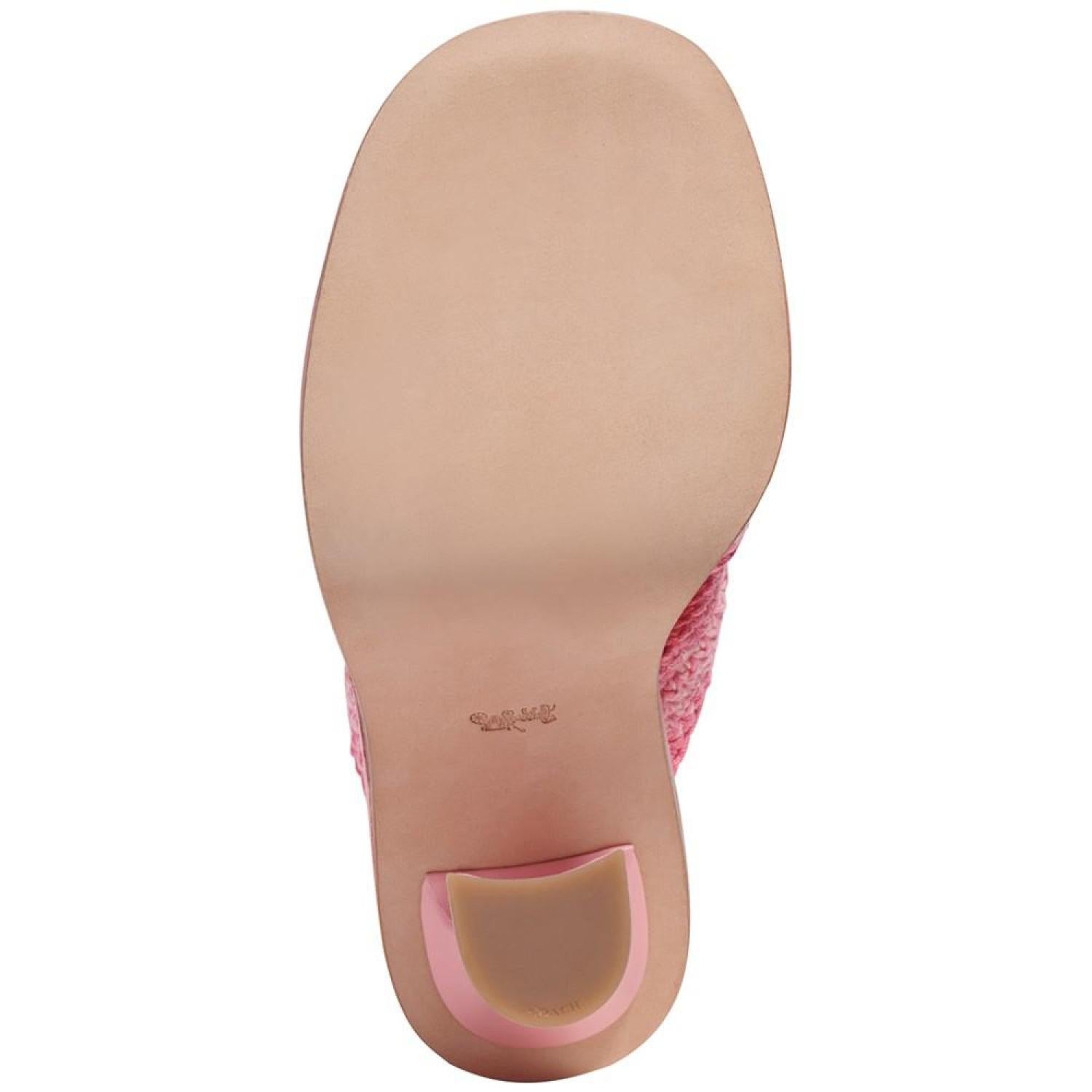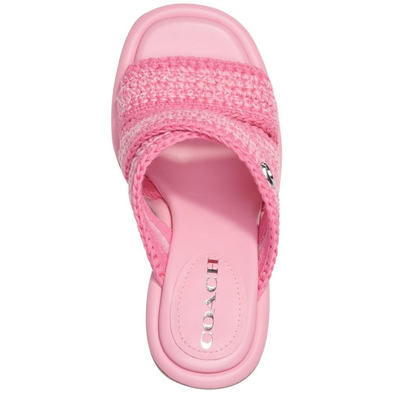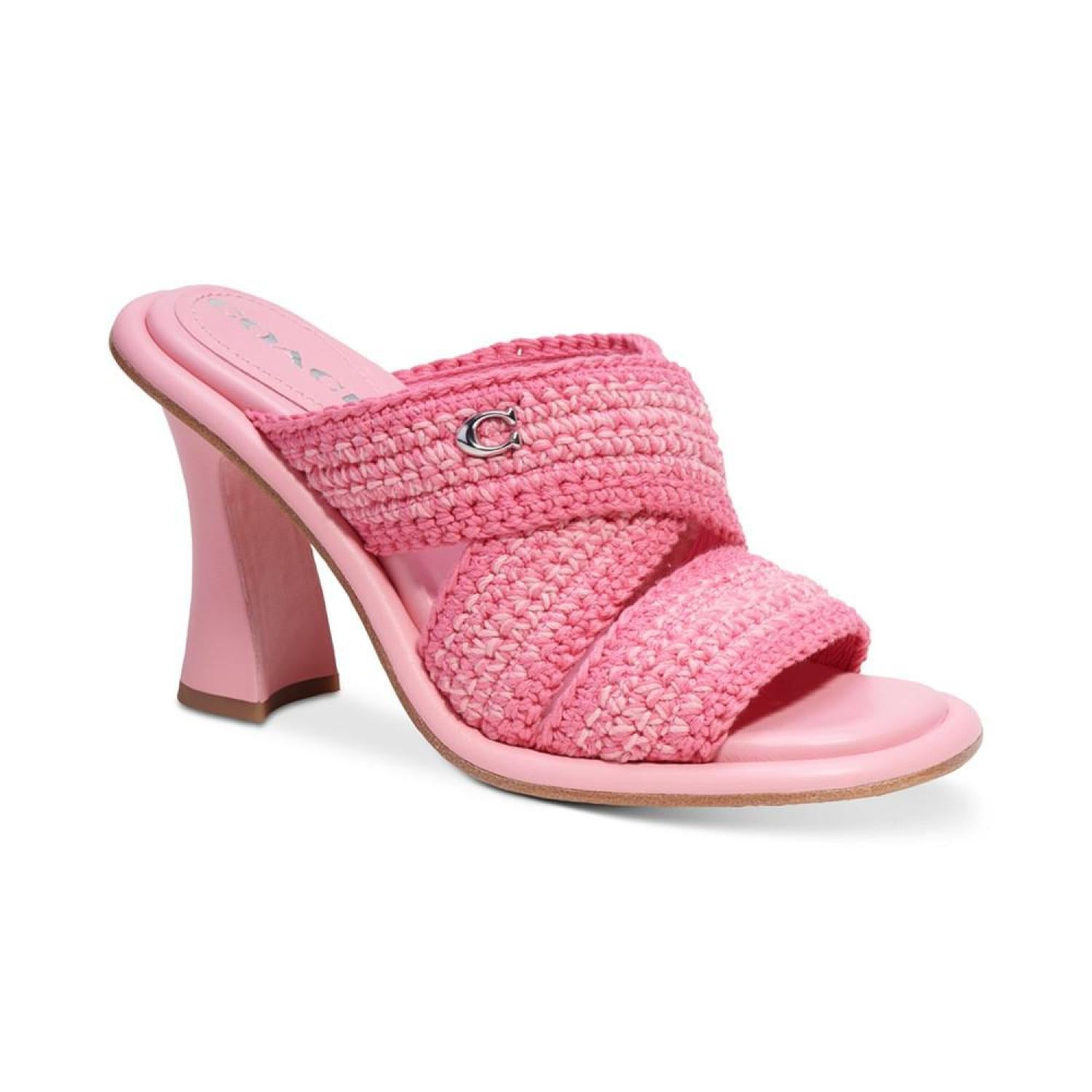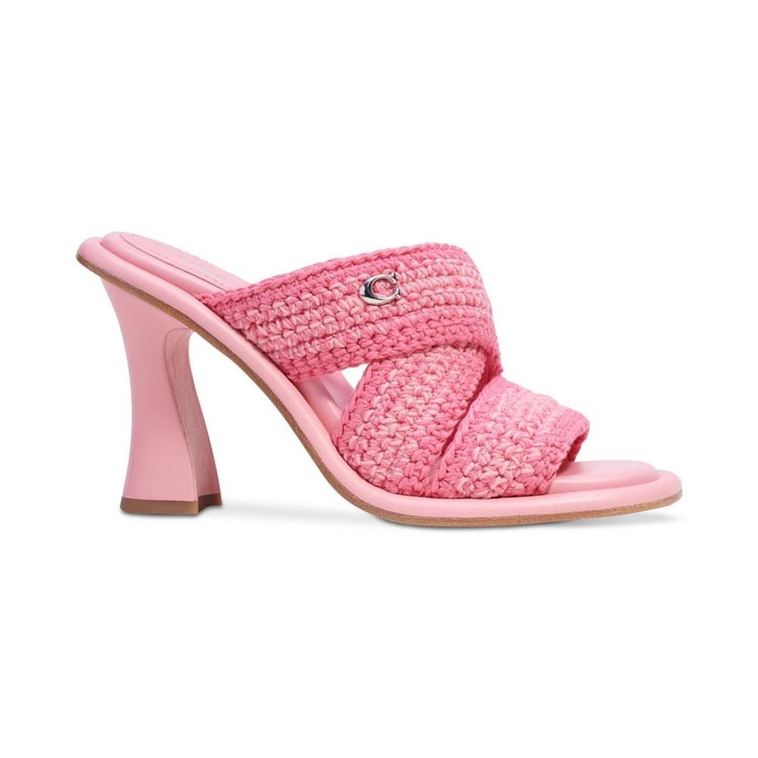 Crisscrossing straps in crochet textures top curvy heels updating a timeless slip-on look in the COACH Quintin sandals.