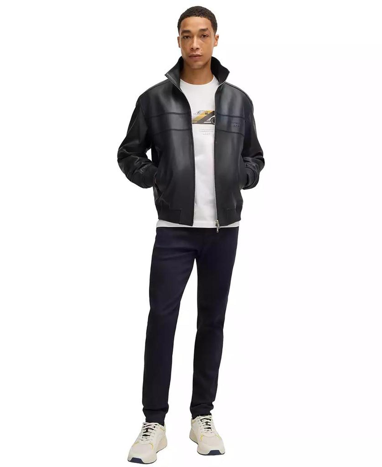 With a stand collar and straight fit, this men's Porsche x Boss jacket has a clean silhouette. Crafted in finest leather with tonal collaborative branding. Part of the Porsche x Boss capsule, a collection of bold styles that captures the Boss attitude of drive and determination. The model wears a size 38R and is 6' 2" tall, with a 37" chest, 31" waist and 37" hips Regular fit Stand collar Fastening top: Zip closure Pockets top: Zip pockets Inside zip pockets Ribbed cuffs Fully lined Fit back length: 65 cm 100% lamb leather Spot clean Imported