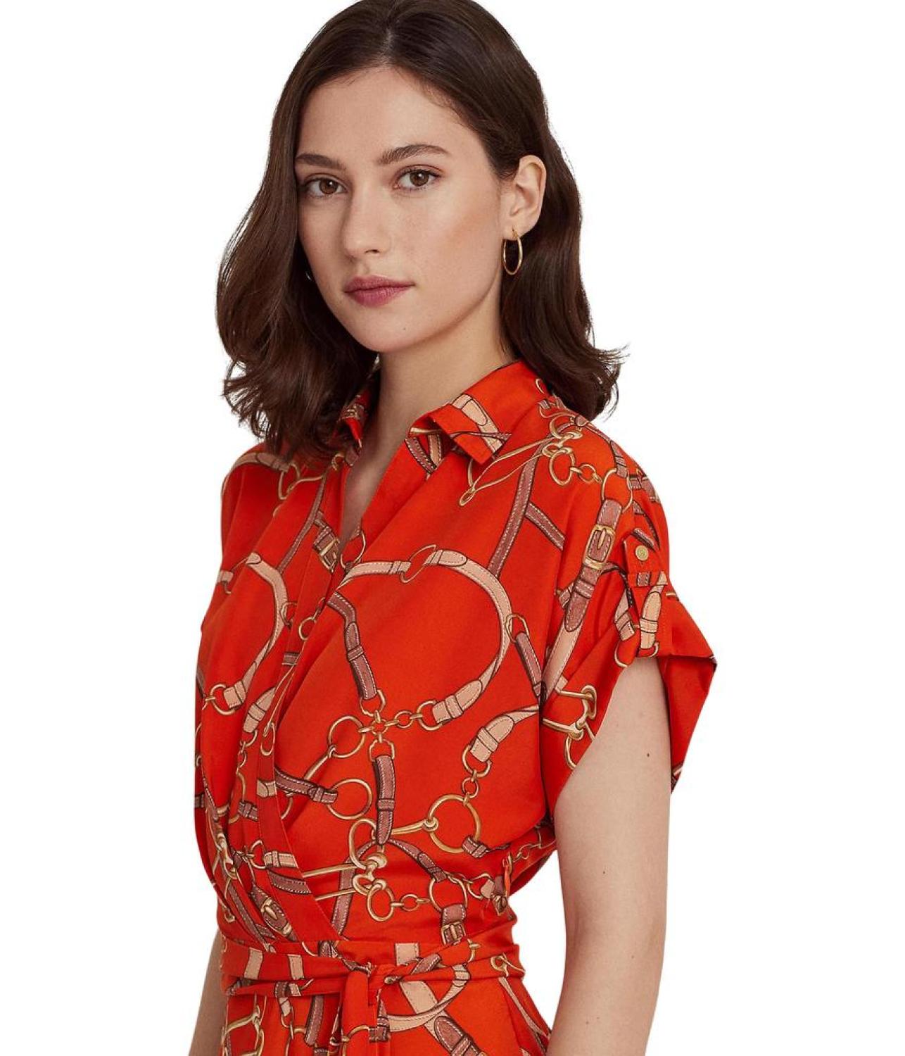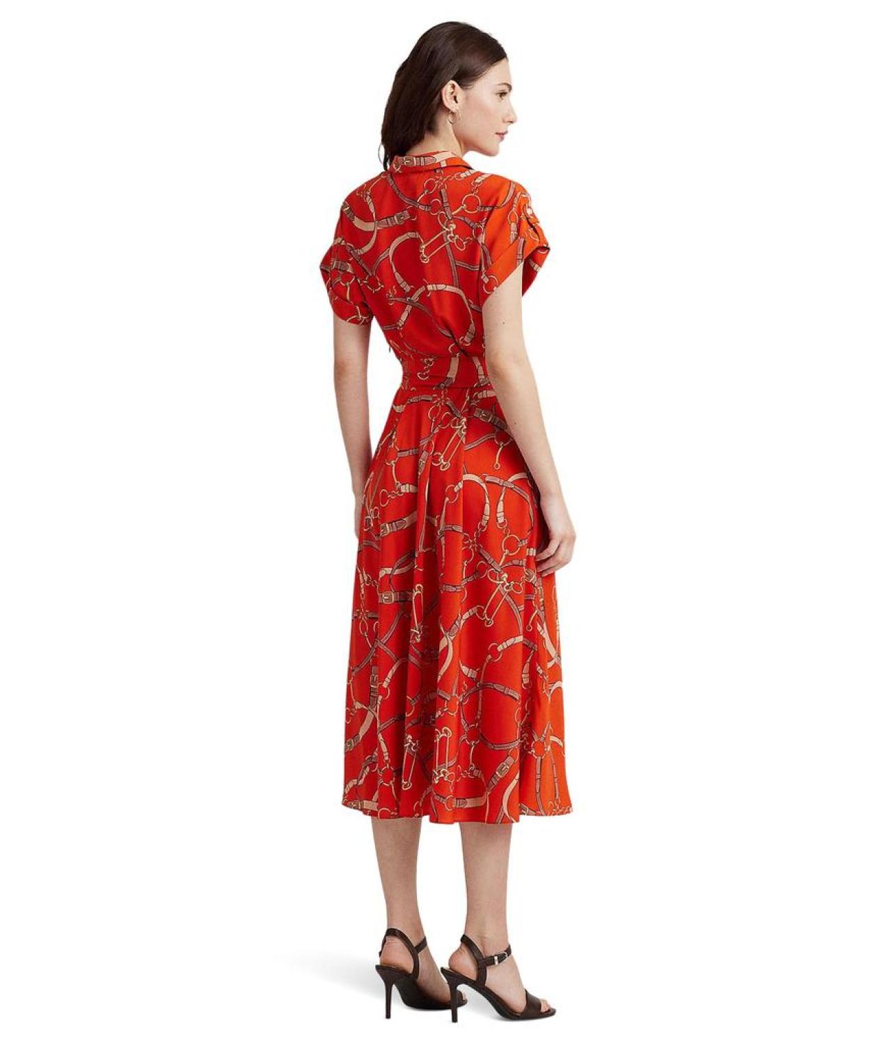 The primary materials that compose this product contain a minimum of 20 percent recycled content. Radiate cheerfullness and take the style statement a notch higher everytime you step out wearing LAUREN Ralph Lauren® Belting-Print Belted Crepe Dress. It comes with a fit-and-flare silhouette, collared neckline, short sleeves with buttoned detailing, and self-belt at the waist. The allover belting print on the dress looks quite stylish. Intended to hit at the calves. Material:Body: 100% recycled polyester;Lining: 100% recycled polyester. Dry clean. Imported.