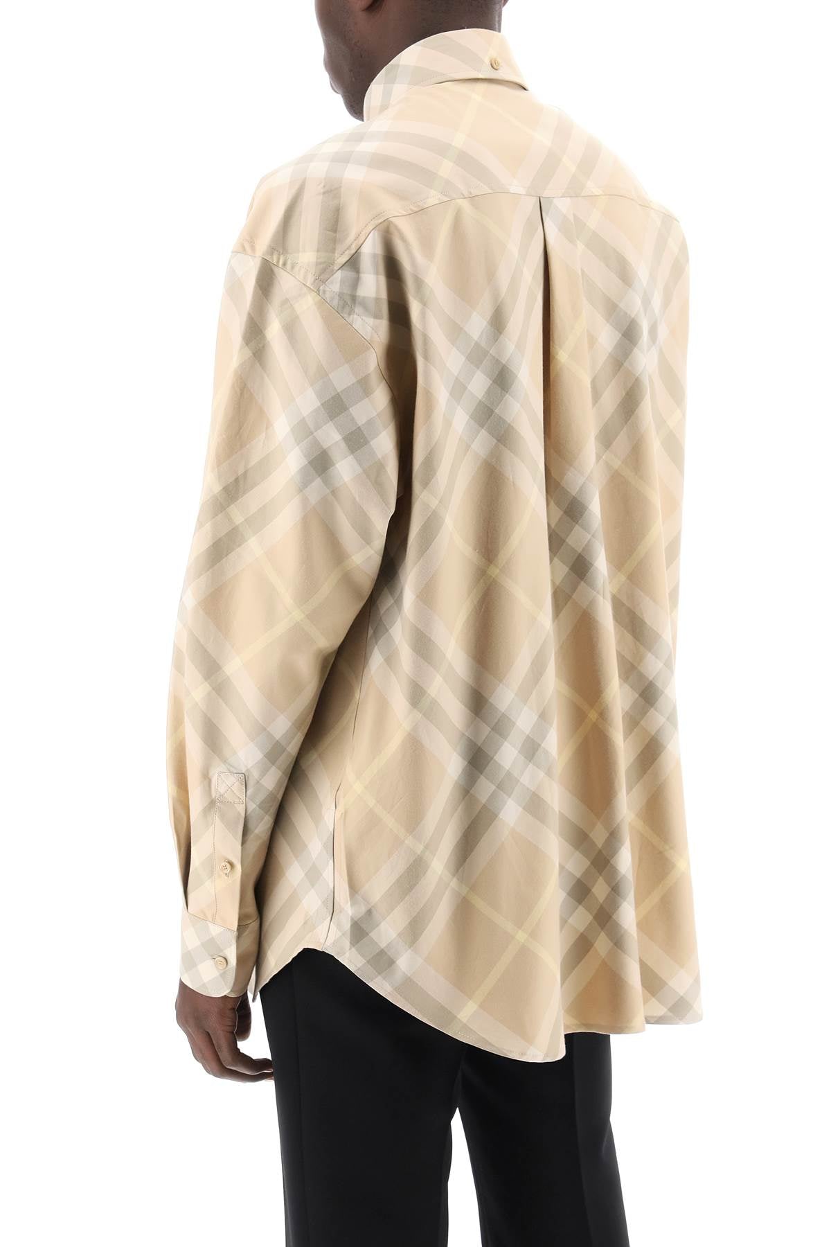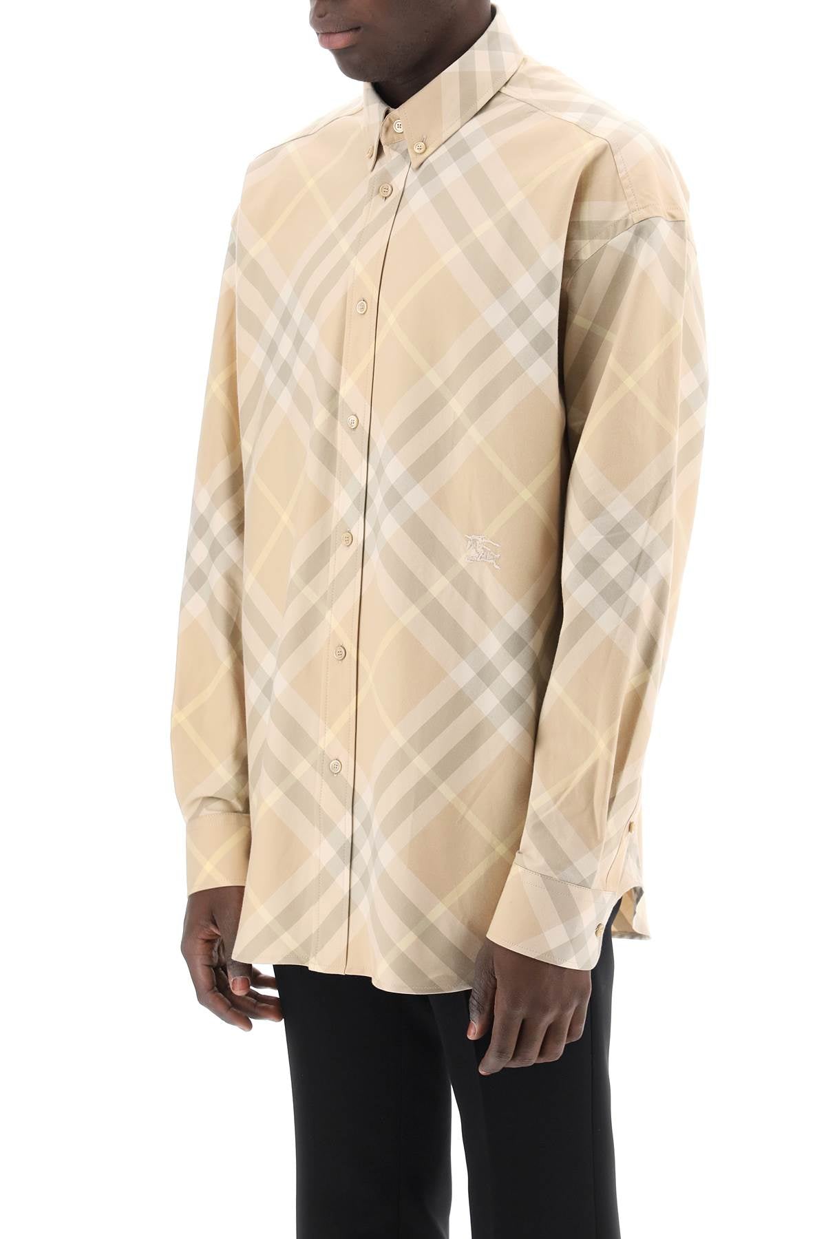 • The Burberry Oversized Shirt is made from organic cotton twill with a Burberry Check print. It features low-set sleeves and is adorned with an embroidered EKD motif on the front. The shirt also has a button-down collar, American-style placket, classic cuffs, and a back yoke with a box pleat. The model is 187 cm tall and wears a size L.
