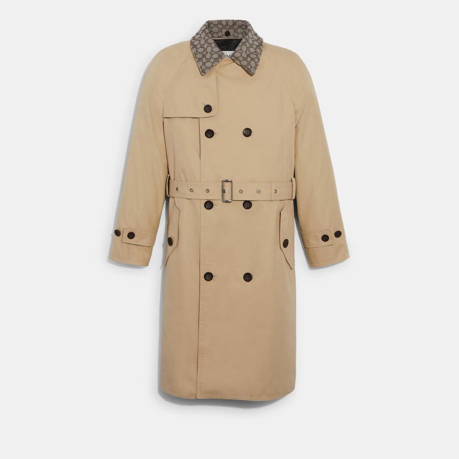 • 71% organic cotton 29% recycled polyester Lining - 56% polyester 44% viscose Leather details Button closure Button pockets Adjustable belt at waist Removable collar Length - 46 3/4 Dry clean Model is 6'2 (188cm) and wears a size M Coach Forever Collection Style No. C8713
