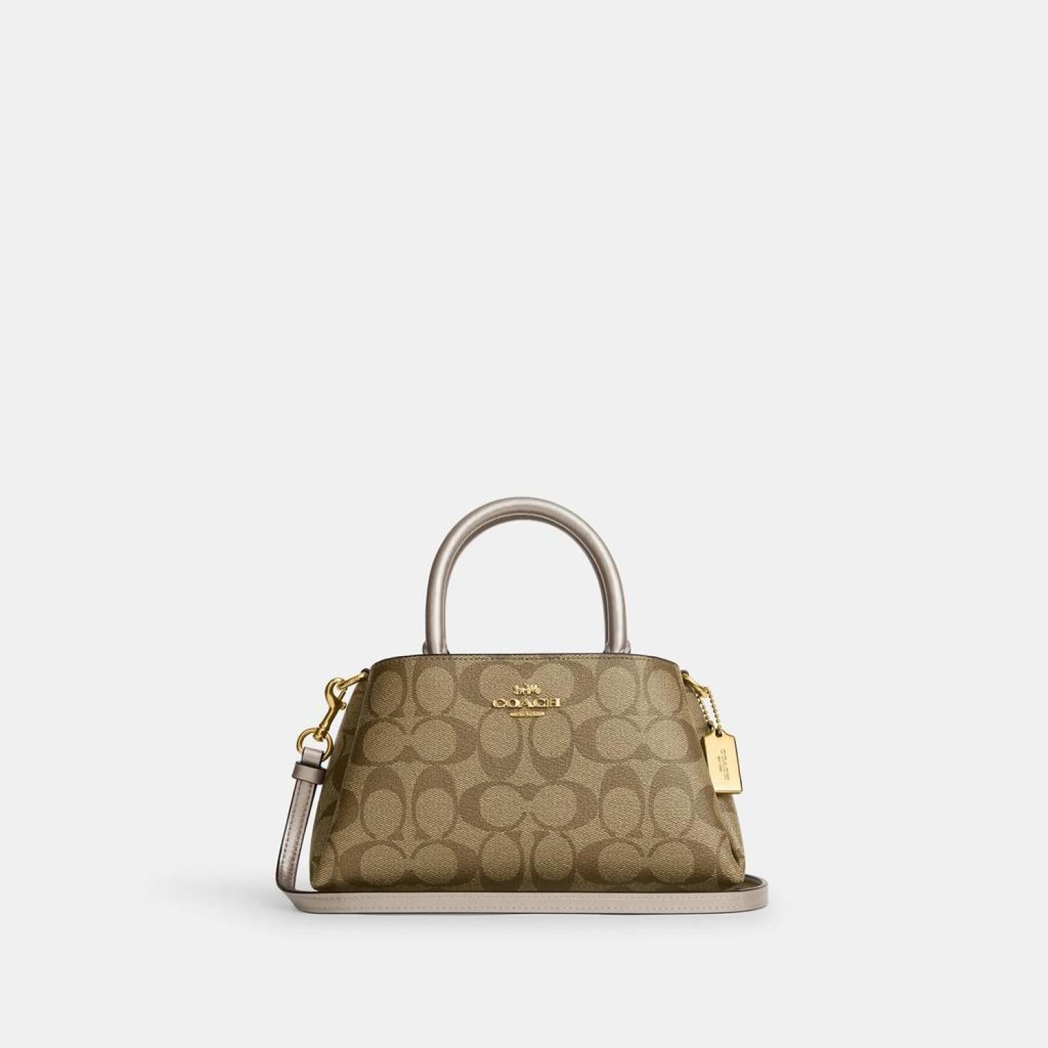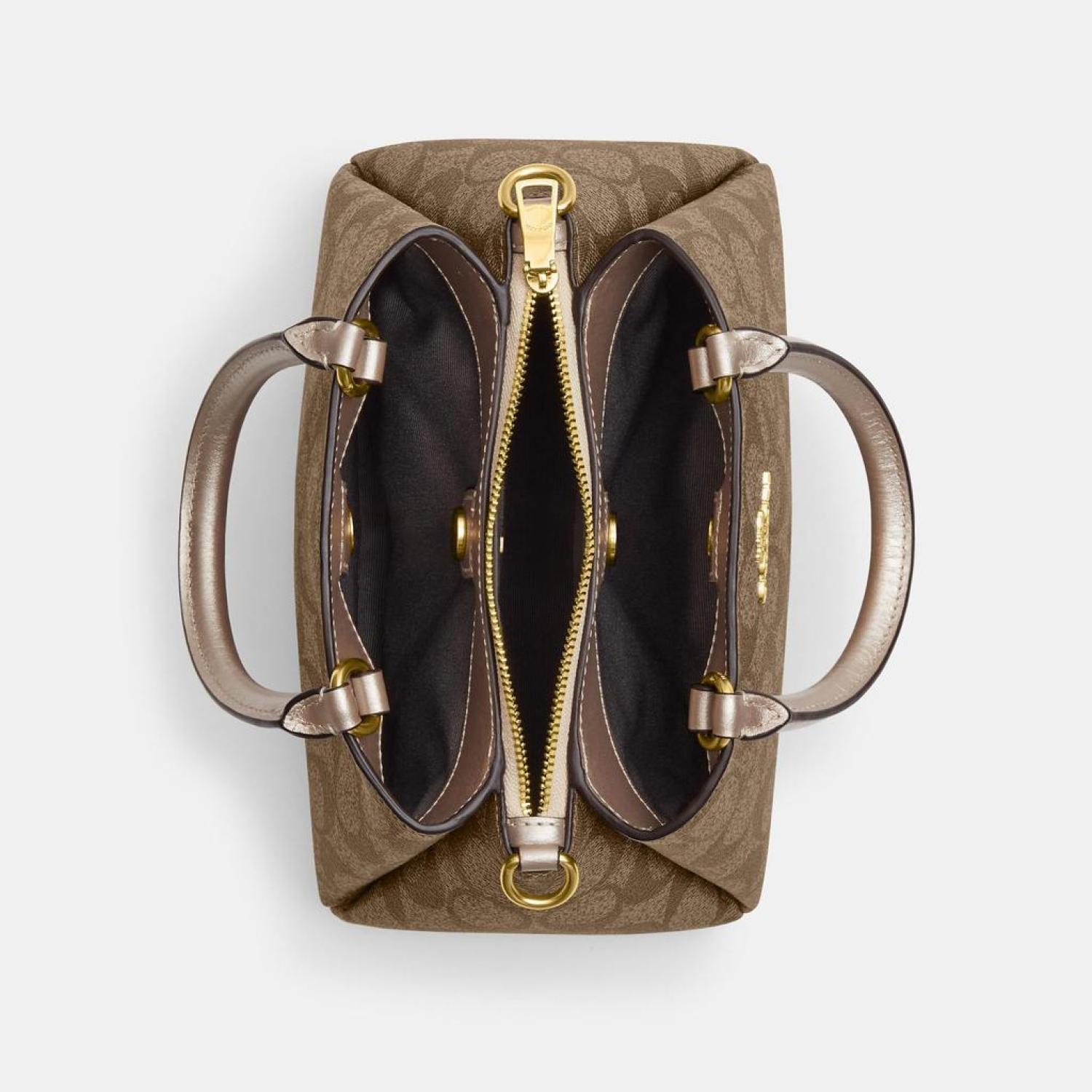 Signature coated canvas and metallic refined calf leather Center zip compartment Snap closure fabric lining Handles with 3 1/4 drop Detachable strap with 22 1/2 drop for shoulder or crossbody wear Four protective feet at base 8 1/2 (L) x 4 1/2 (H) x 5 (W) Style No. CN308 | Coach Outlet Zuri Crossbody In Signature Canvas - Multi