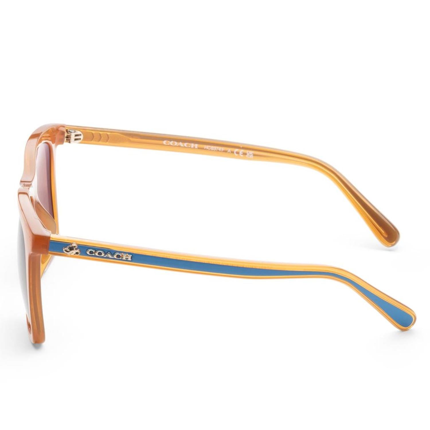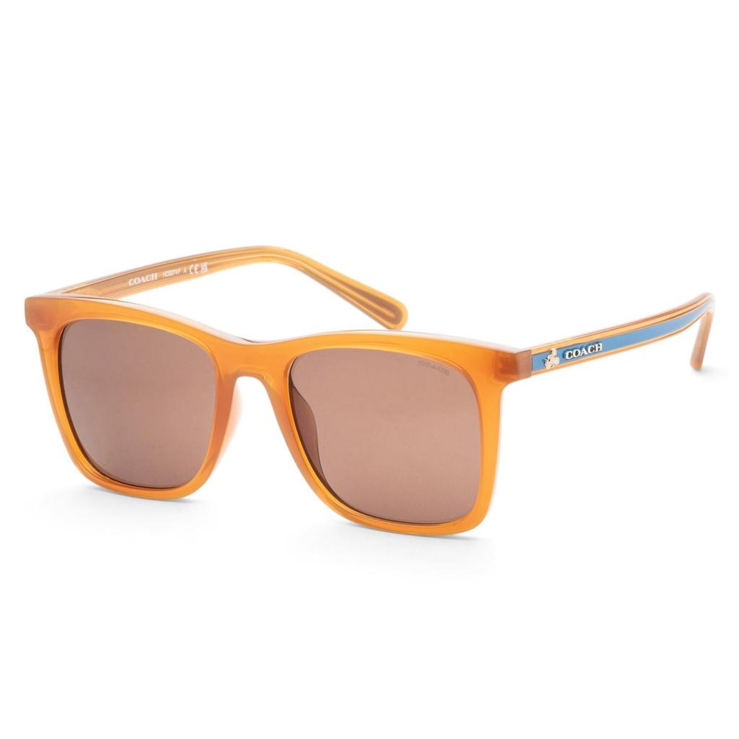 Coach Women's Sunglasses. Dimensions - 54 mm x 19 mm x 145 mm. Transparent Buttercup Square Plastic frame, Brown Solid lenses. 100% UV Protection, Non-Polarized. Made in China. (HC8374F-57483G-54)