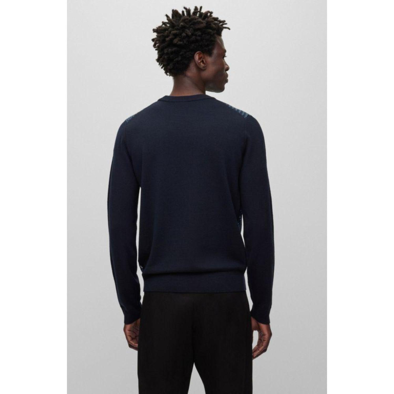 • A crew-neck sweater by BOSS Menswear, cut to a straight fit, blended with virgin wool and knitted with a jacquard pattern on the front.