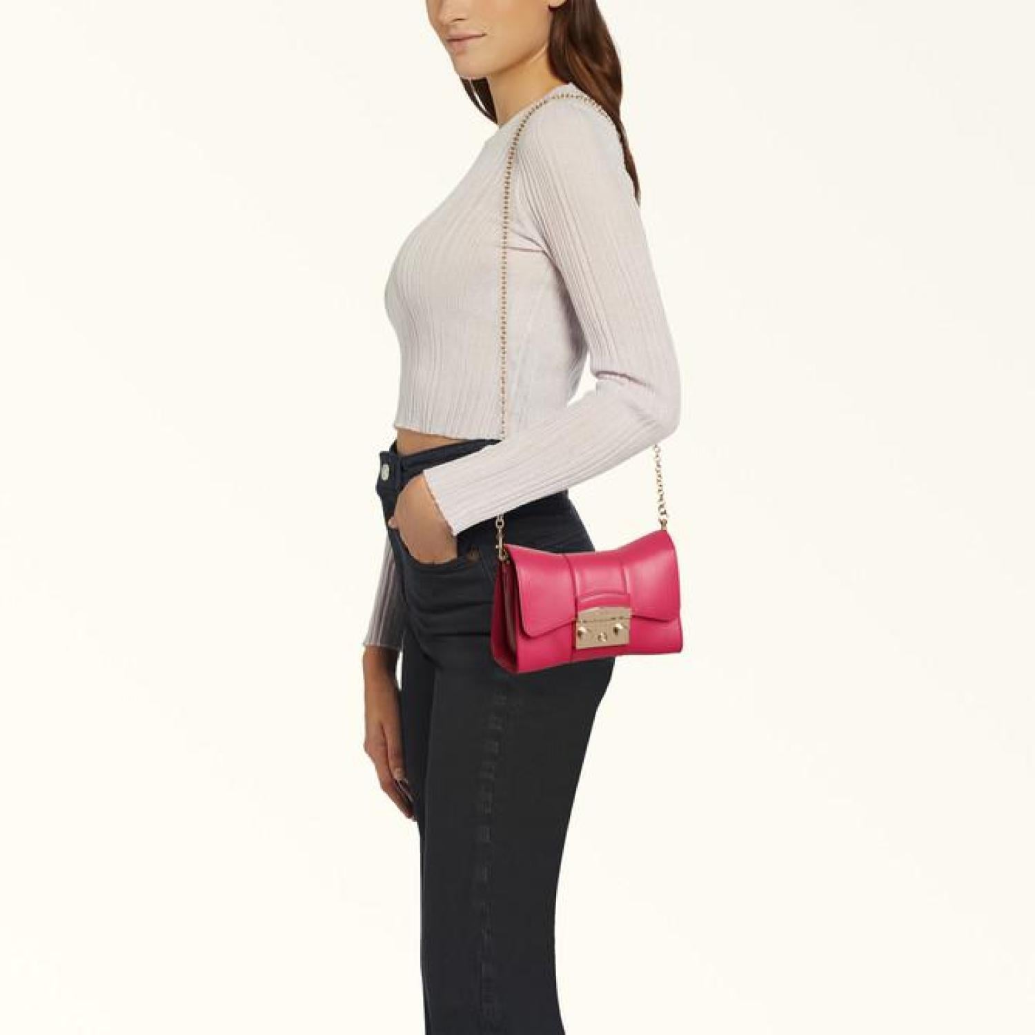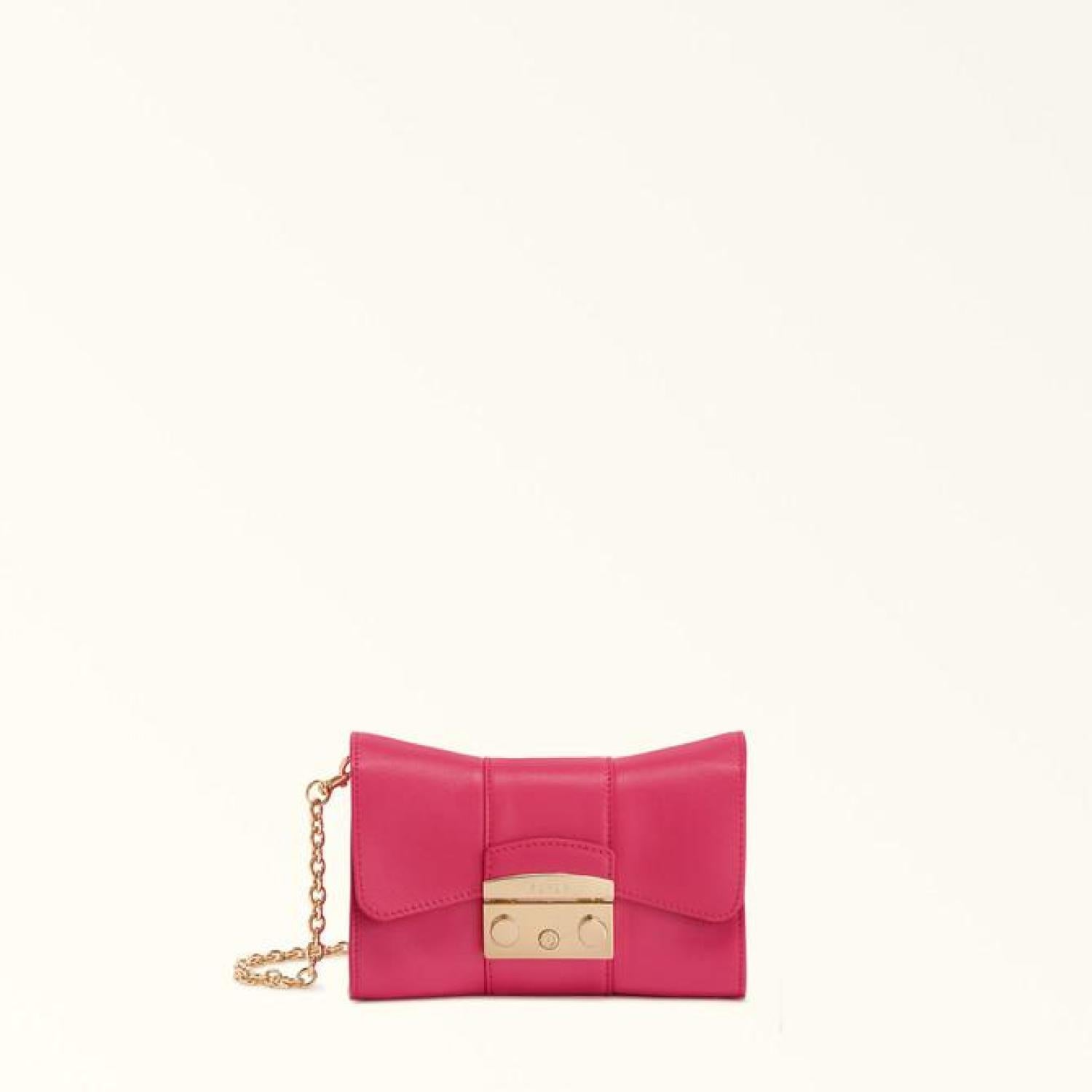 This elegant Furla Metropolis Remix mini crossbody is versatile enough to be worn on the shoulder, crossbody, or carried as a sophisticated clutch by tucking the chain strap inside. A reinterpretation of the iconic Furla Metropolis bag, the bow-shaped piece is crafted in soft and smooth leather, and the small and compact size makes it the perfect choice for keeping all your small essential items within easy reach. - Two open inside pockets - Removable shoulder strap - Snap button closure and engraved Furla logo Dimensions 7.09 x 4.92 x 3.15 (w x h x d) material Smooth Calf Leather composition 100% Leather Height 4.92 in product code WB00930_BX1709_9076_2504S