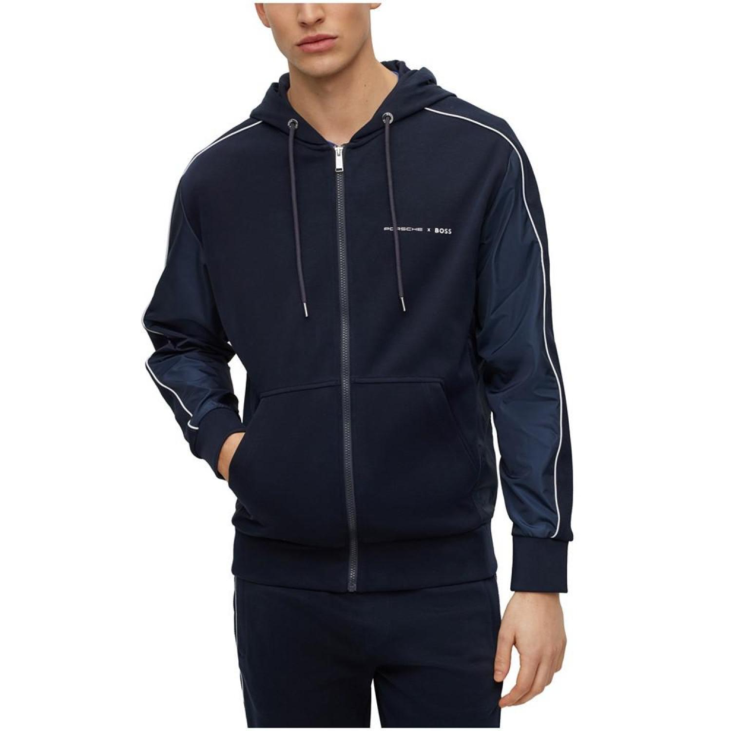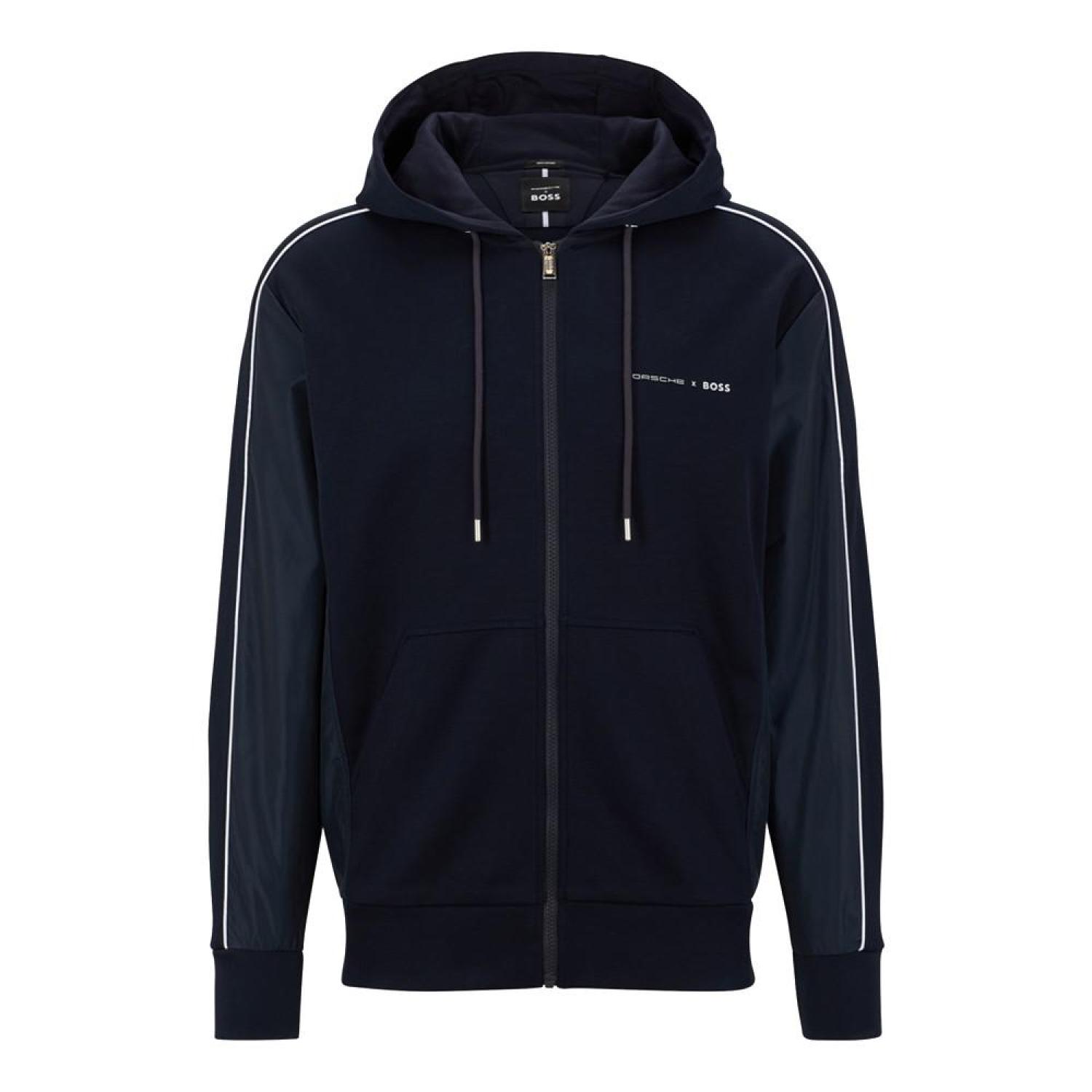A distinctive hoodie with a zip-up closure by BOSS Menswear. Featuring tonal mesh and contrast piping, this hooded sweatshirt is cut to a straight fit in a combination of materials including cotton-rich interlock fabric. Part of the Porsche x BOSS collection. Regular fit Long sleeves Standard length The model is a size 32R and is 6'2" tall with a, 38" chest, 29" waist and 36" hips Cotton, Polyester Machine Washable Imported