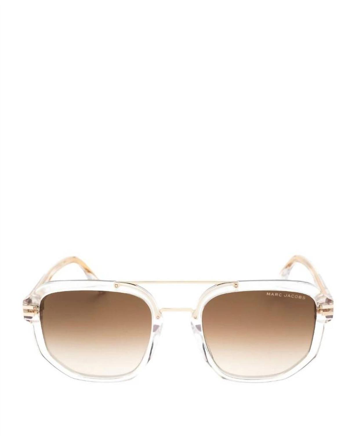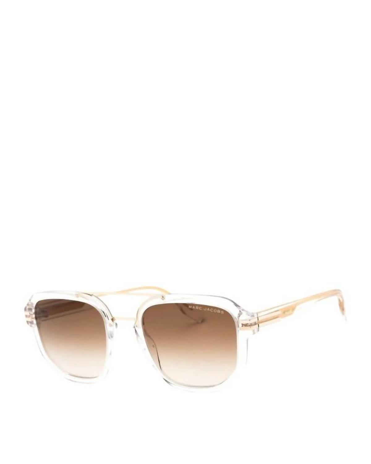 Featuring a transparent square frame in a striking crystal/brown SF hue, these sunglasses boast gradient lenses and a gold-tone double bridge for a sleek look. They offer dimensions of 56 mm lens width, 16 mm bridge width, 145 mm arm length, and 138 mm frame width, ensuring a perfect fit. Enjoy comfortable temples and 100% UV protection while showcasing impeccable style.