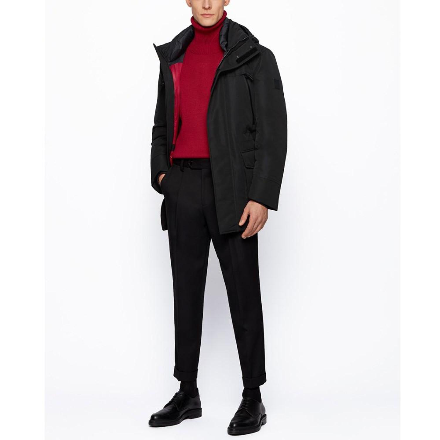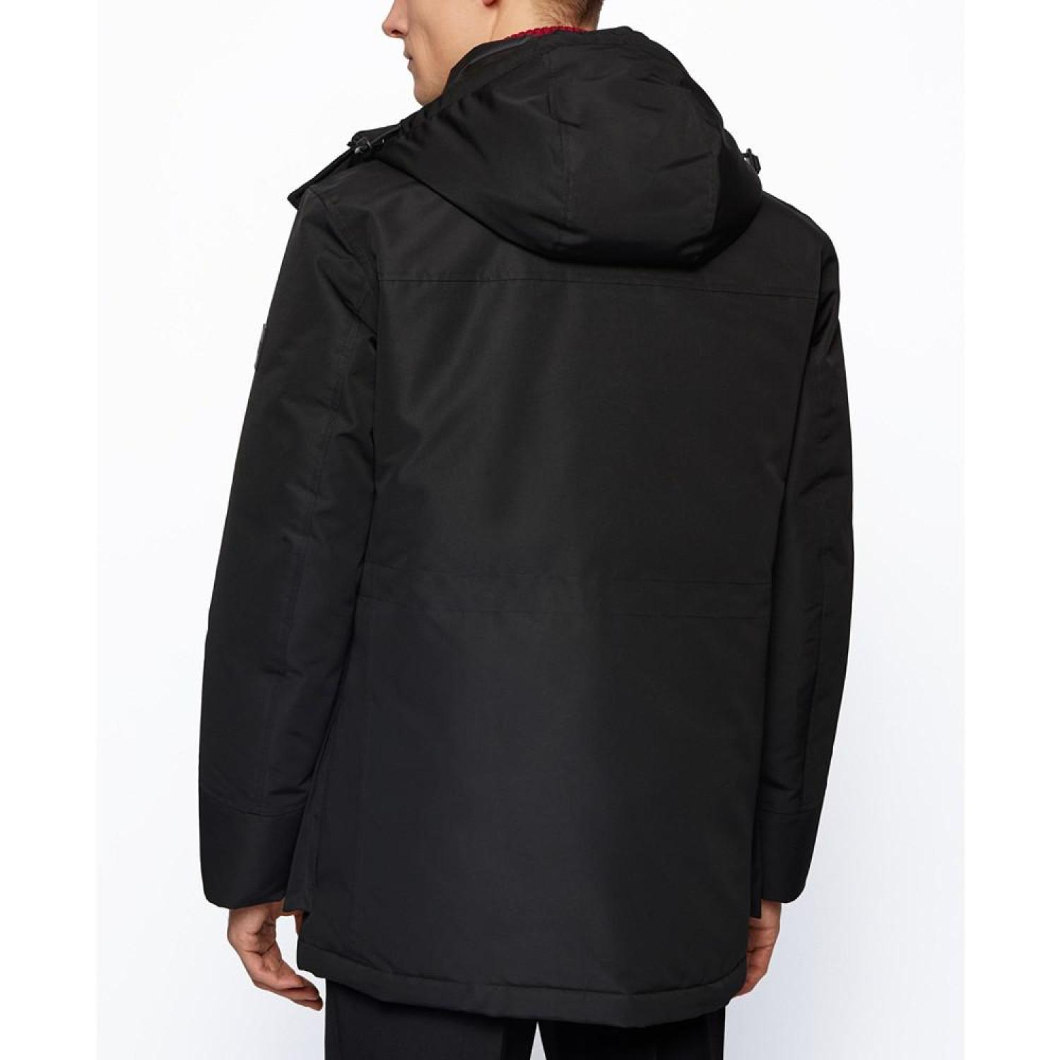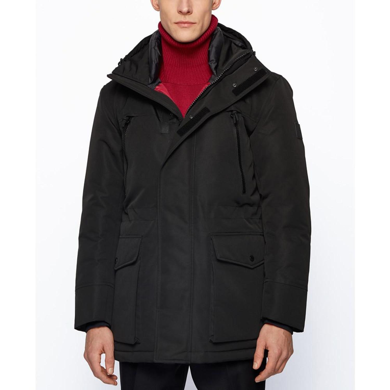 • A contemporary spin on the parka, by BOSS Menswear. Trimmed with a logo badge at the left sleeve and featuring multiple pockets, this regular-fit jacket is crafted in water-repellent fabric with a cotton-like feel and lined with recycled polyester. A sustainably sourced filling of duck down and feather completes the line-up of more responsible production choices.