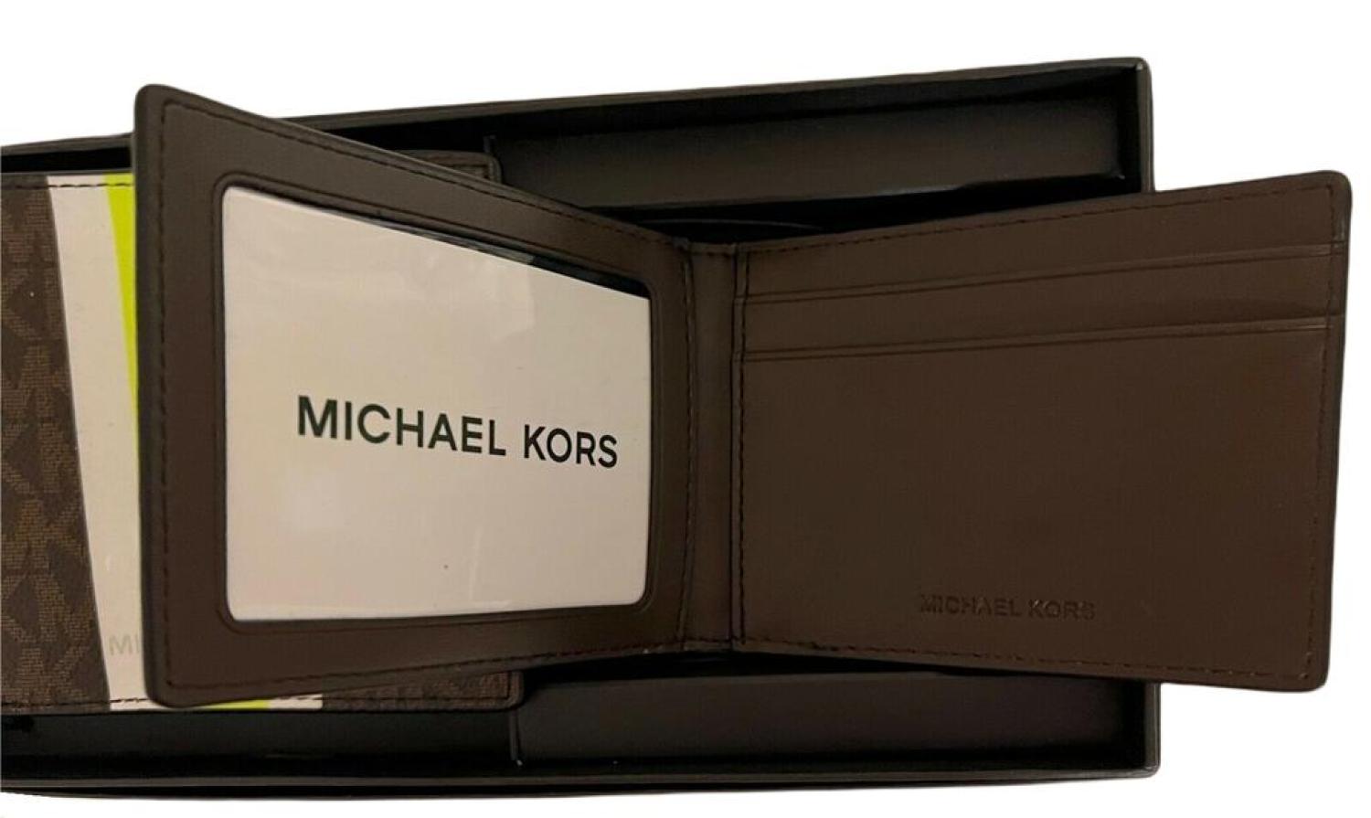 Made of PVC; 8 card slots, 2 bill compartments and 2 side slips Removable passcase inside - 2 card slots, 1 ID window and 1 side slip Interior MK signature fabric lining Measurements - Length - 4 x Height - 3.5 x Width - 0.75 Inches Comes with original tags