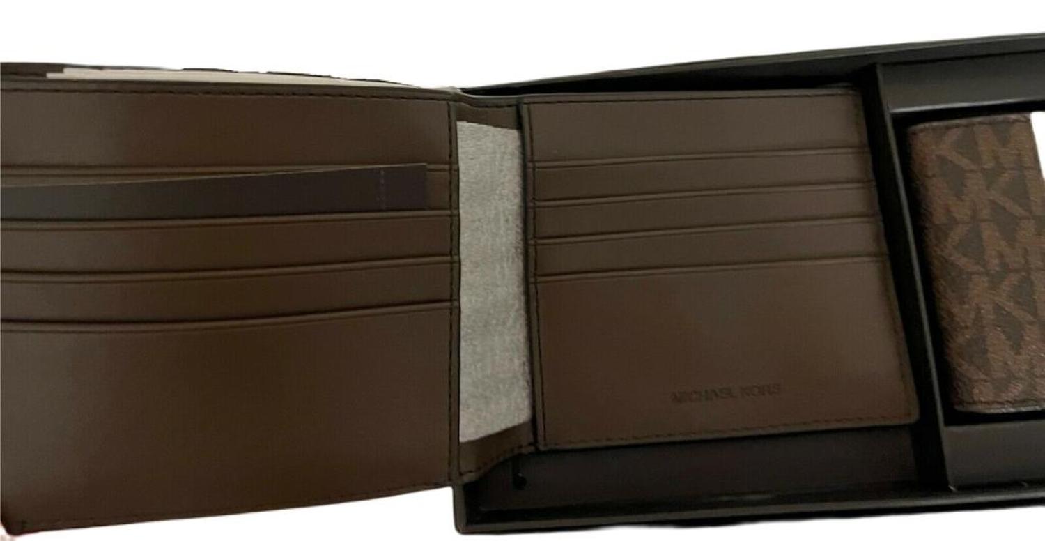 • Made of PVC; 8 card slots, 2 bill compartments and 2 side slips Removable passcase inside - 2 card slots, 1 ID window and 1 side slip Interior MK signature fabric lining Measurements - Length - 4 x Height - 3.5 x Width - 0.75 Inches Comes with original tags