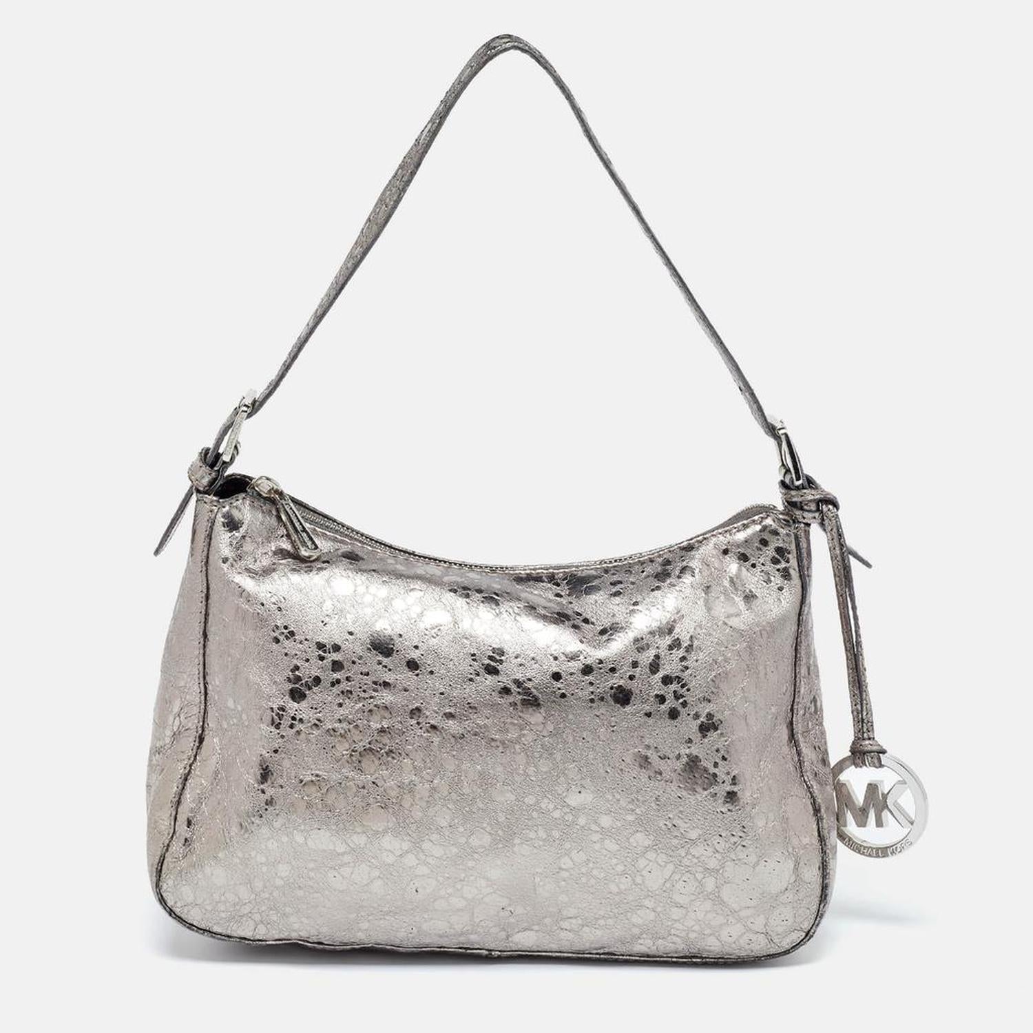 Michael Kors Metallic Grey Textured Patent And Leather Logo Charm Shoulder Bag